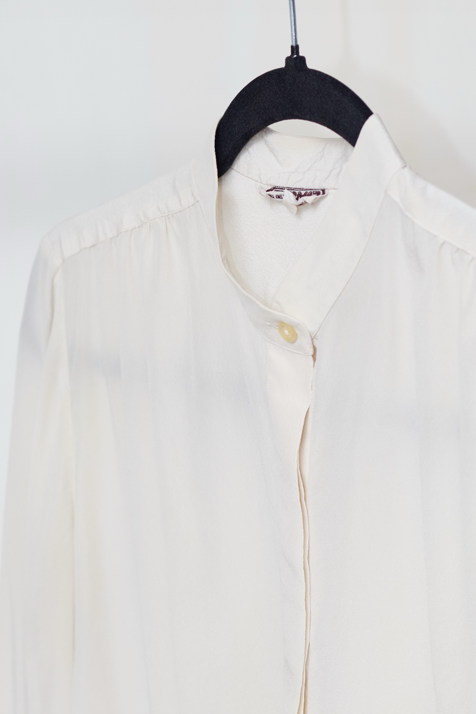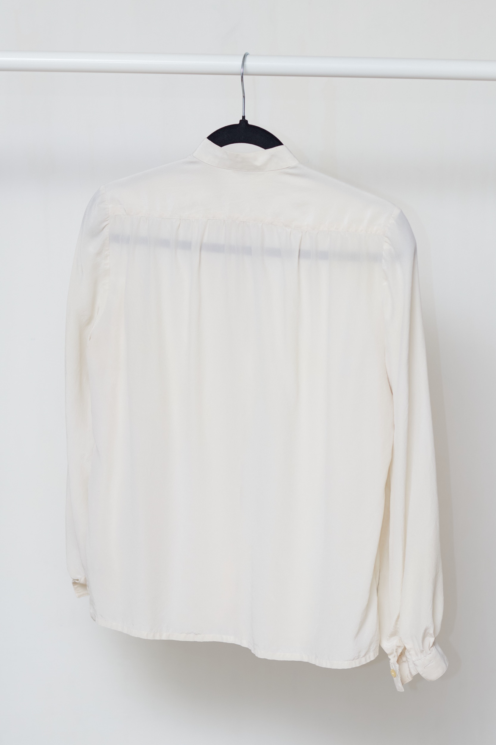 O piesă de o finețe aparte, această cămașă este realizată din mătase naturală 100%, oferind o transparență delicată și o textură extrem de fluidă. Piesa dispune de un guler de tip tunică (mandarin) și o fentă de nasturi ascunsă, menținând un aspect curat în partea frontală. Mânecile sunt ușor voluminoase, fiind finisate cu manșete. Prezintă o platcă (yoke) cu pliuri fine pentru un plus de volum și lejeritate în mișcare.