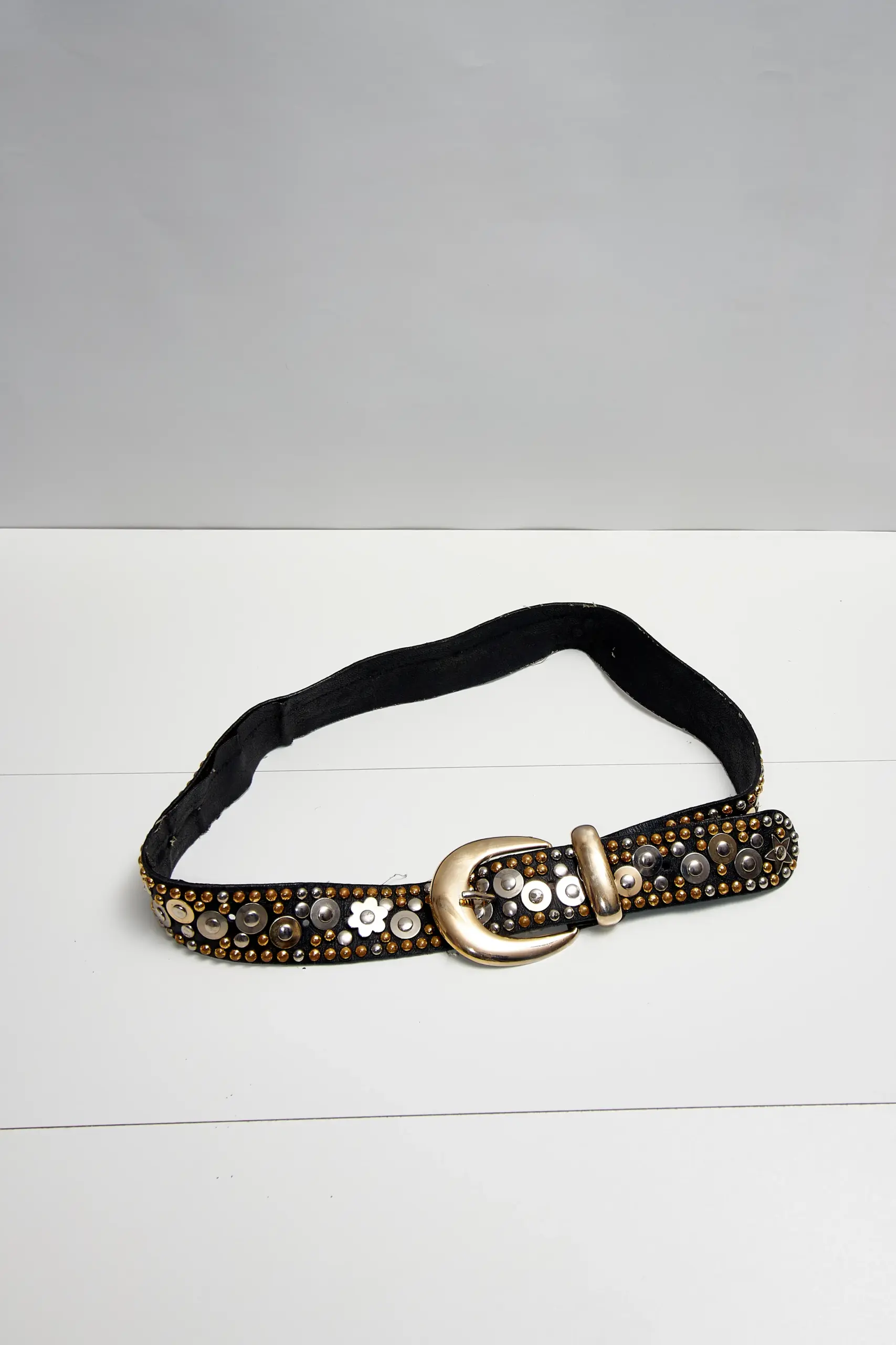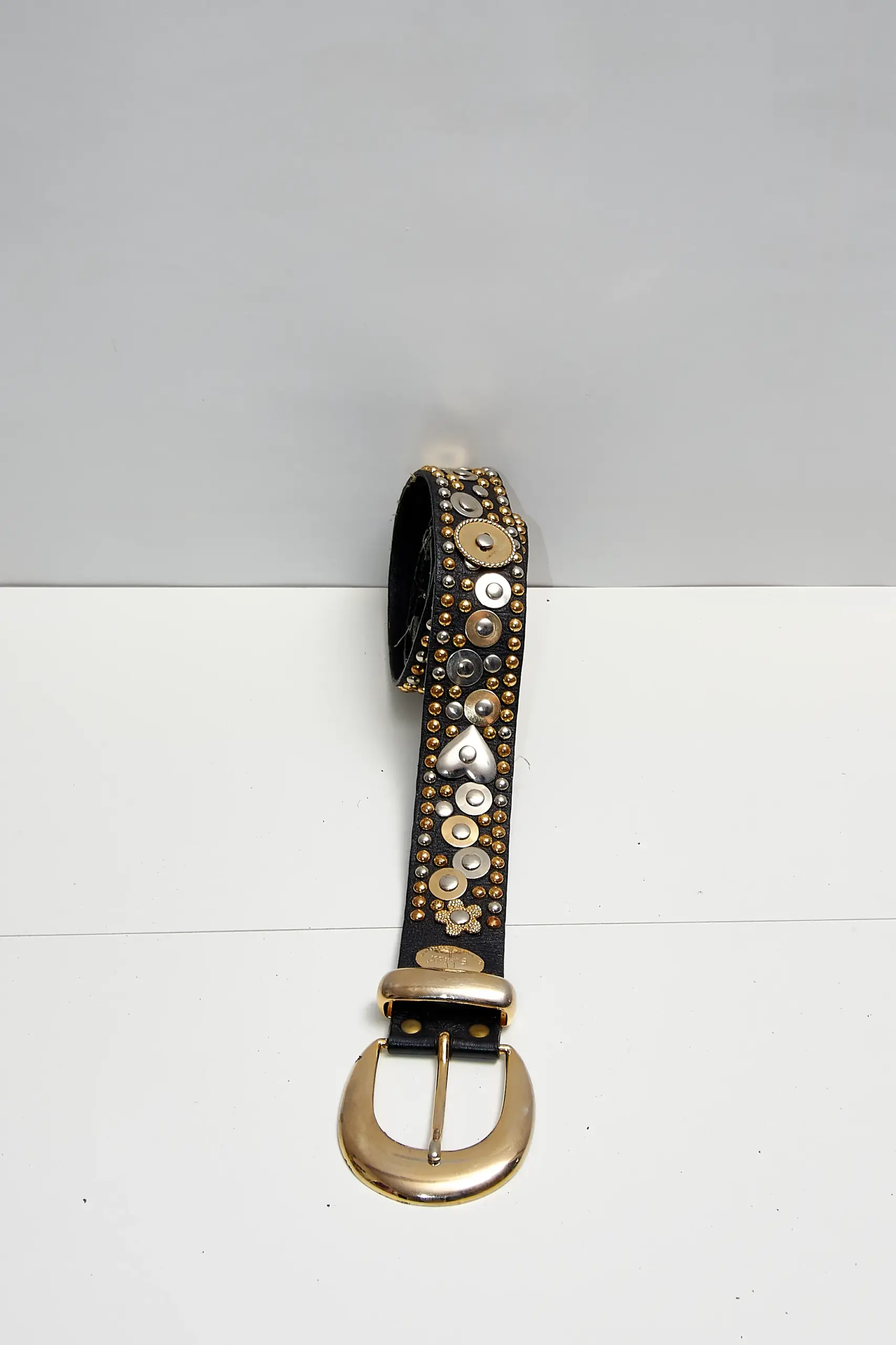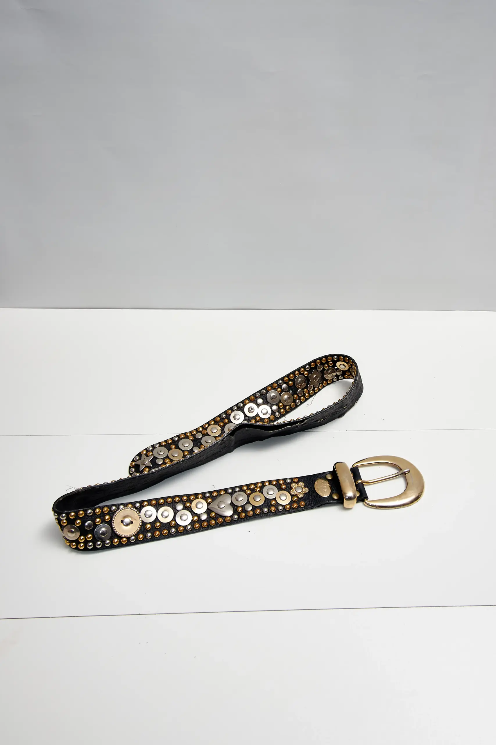 Centură boemă din piele autentică cu ornamente aurii si argintiit, lungime 95cm, lățime 3cm.