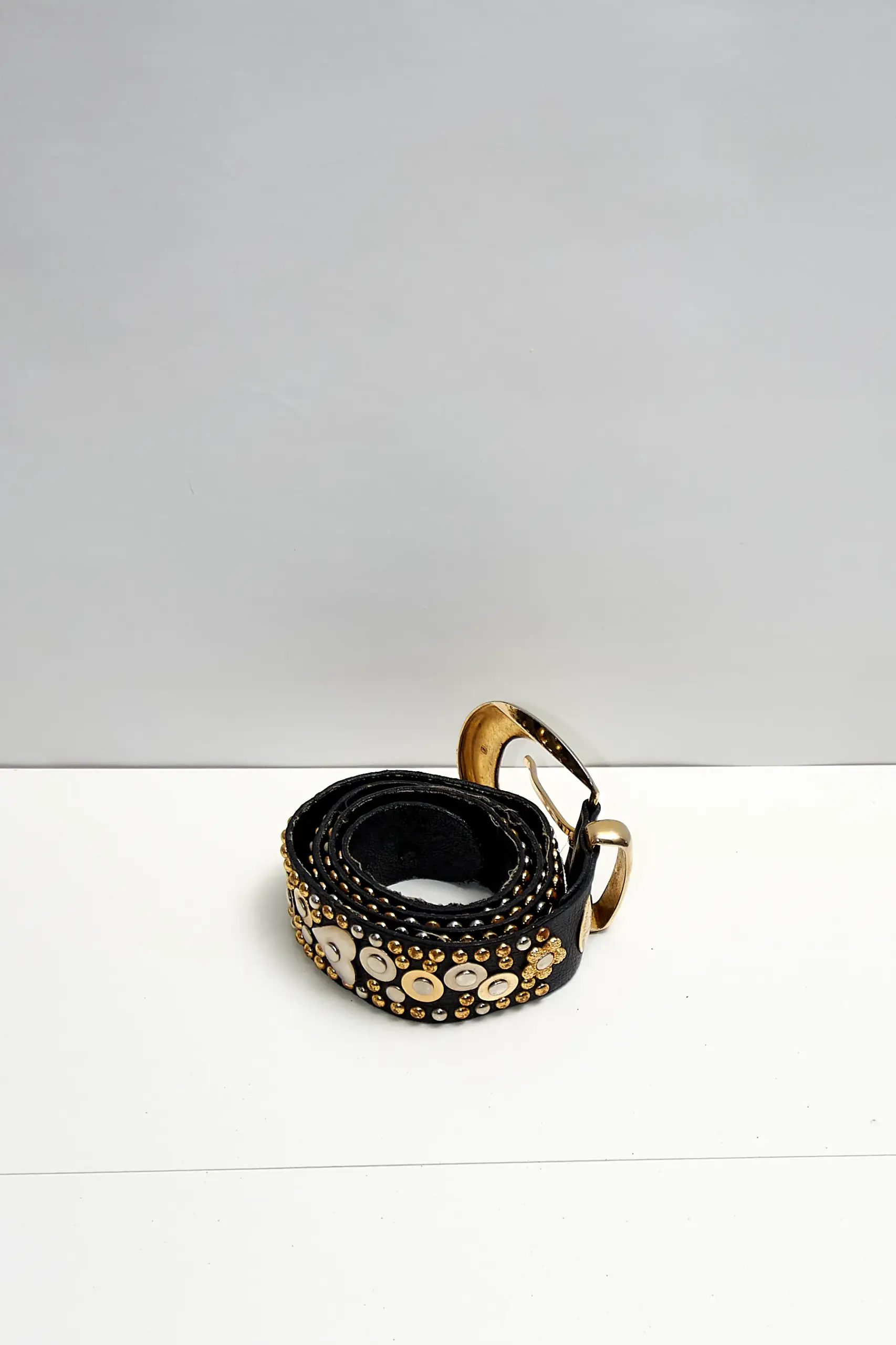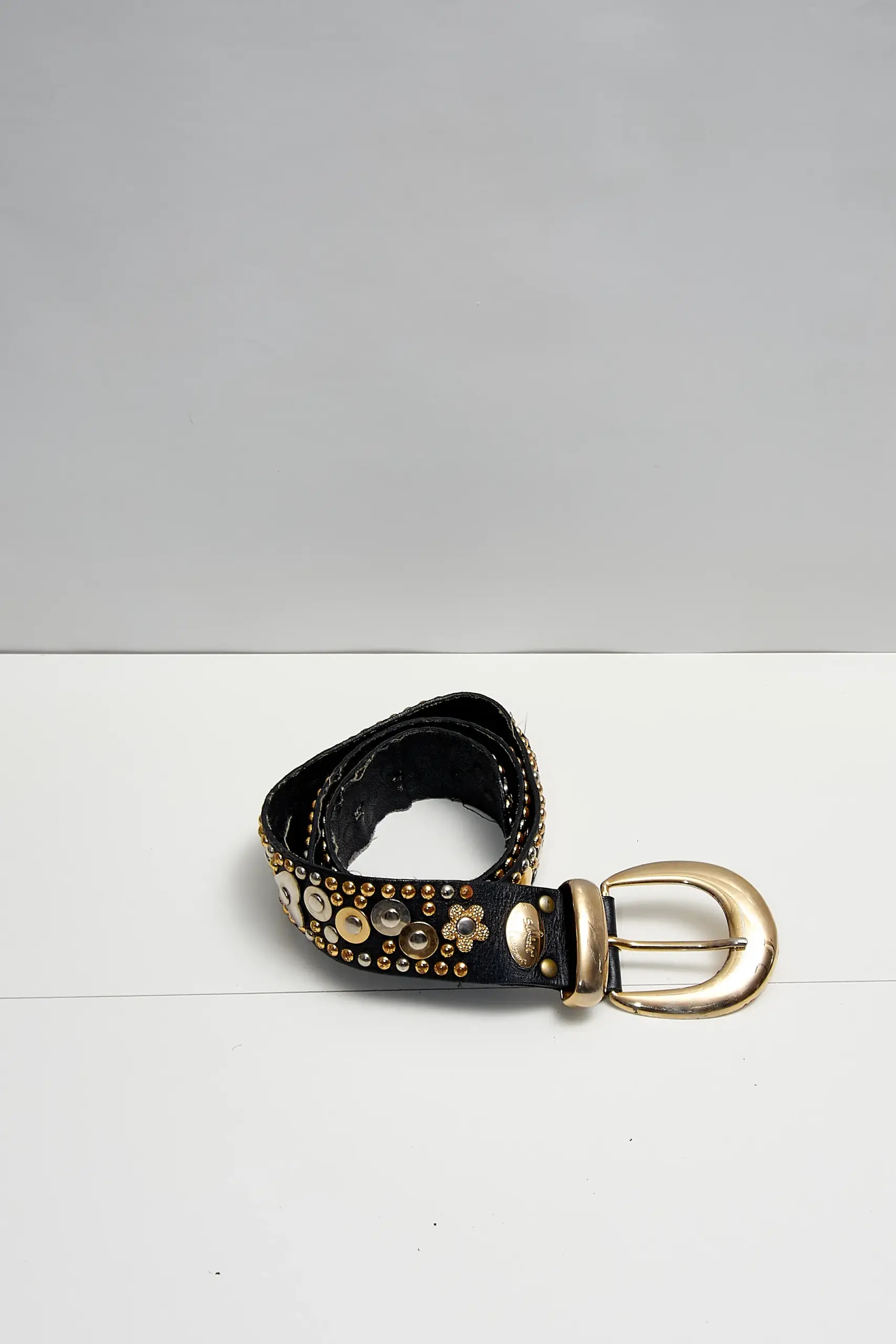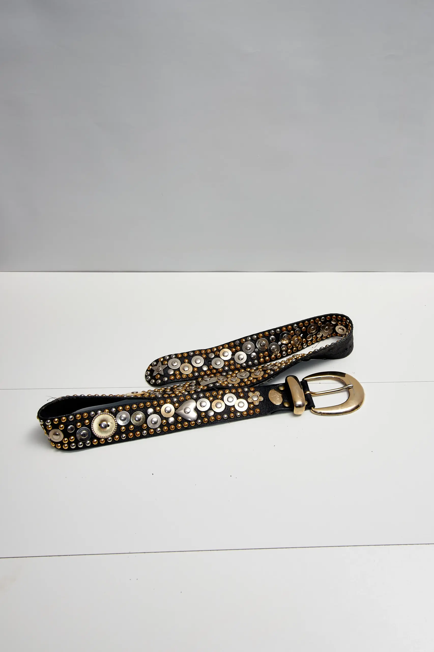 Centură boemă din piele autentică cu ornamente aurii si argintiit, lungime 95cm, lățime 3cm.
