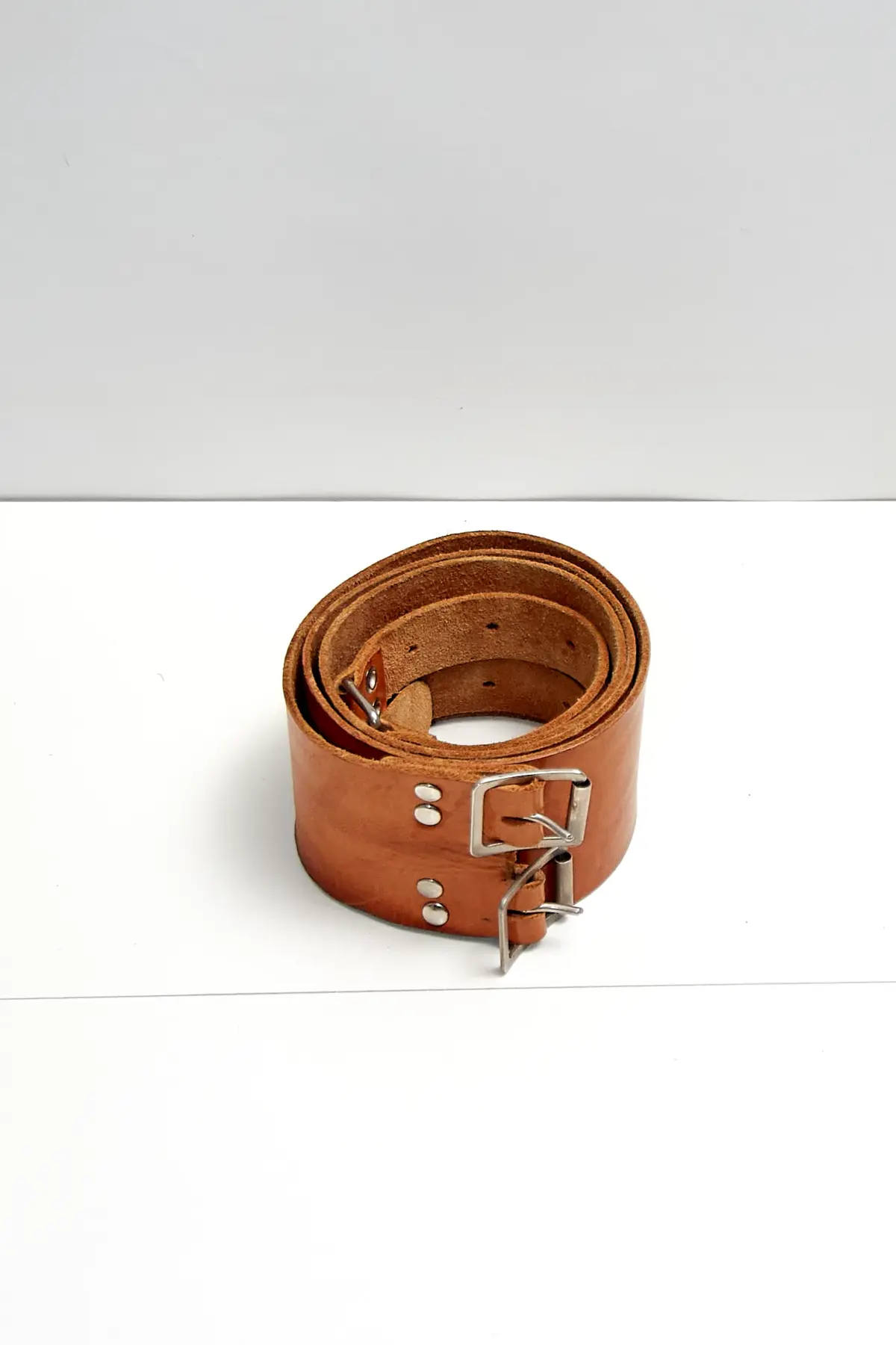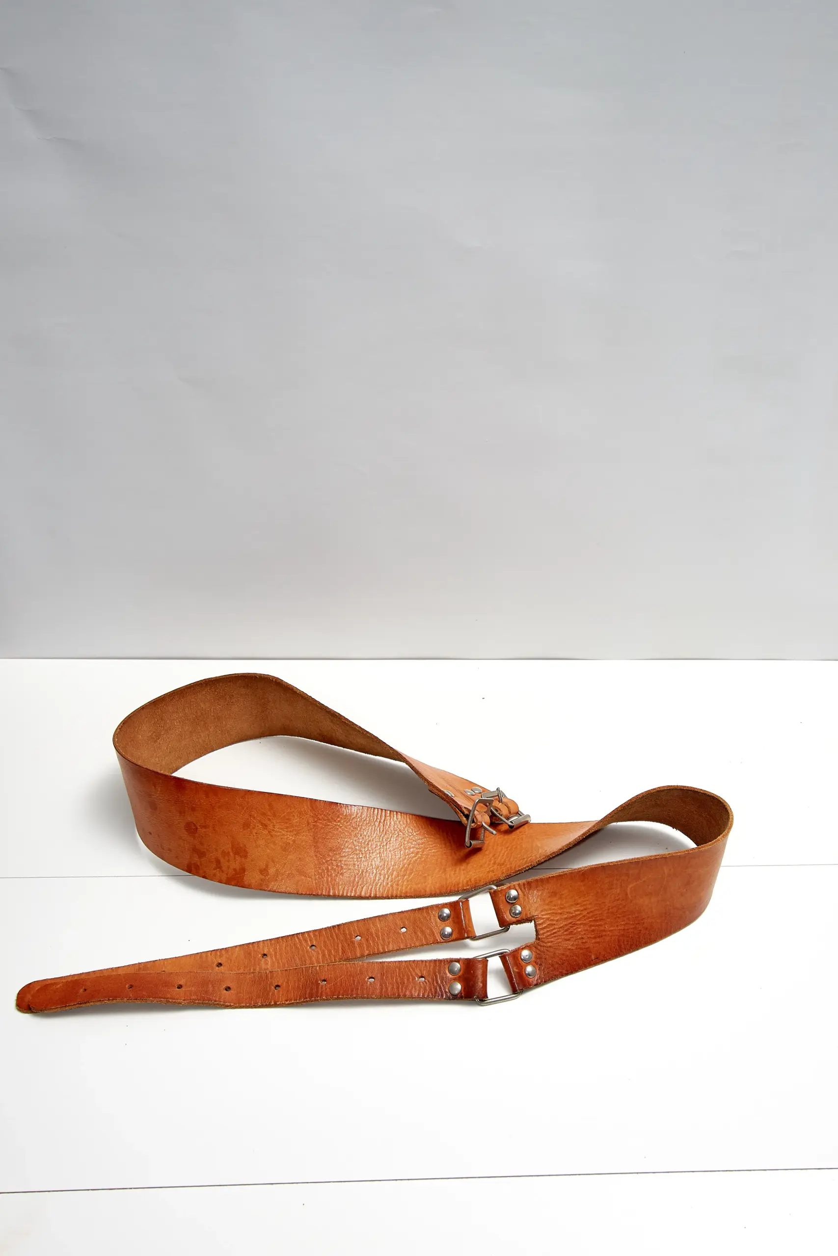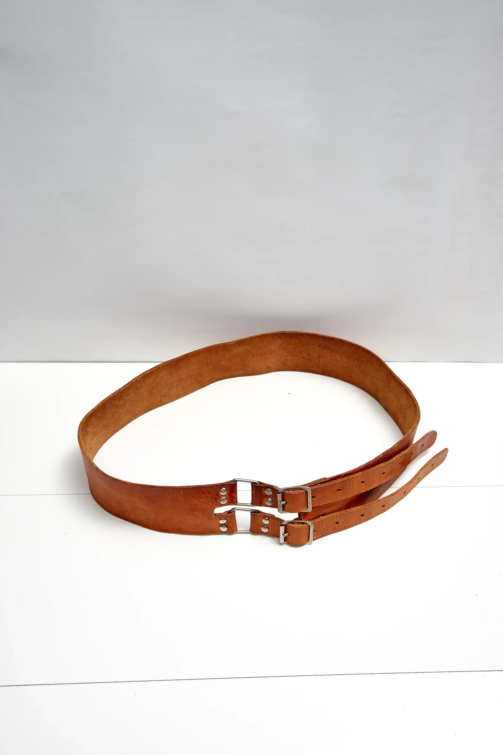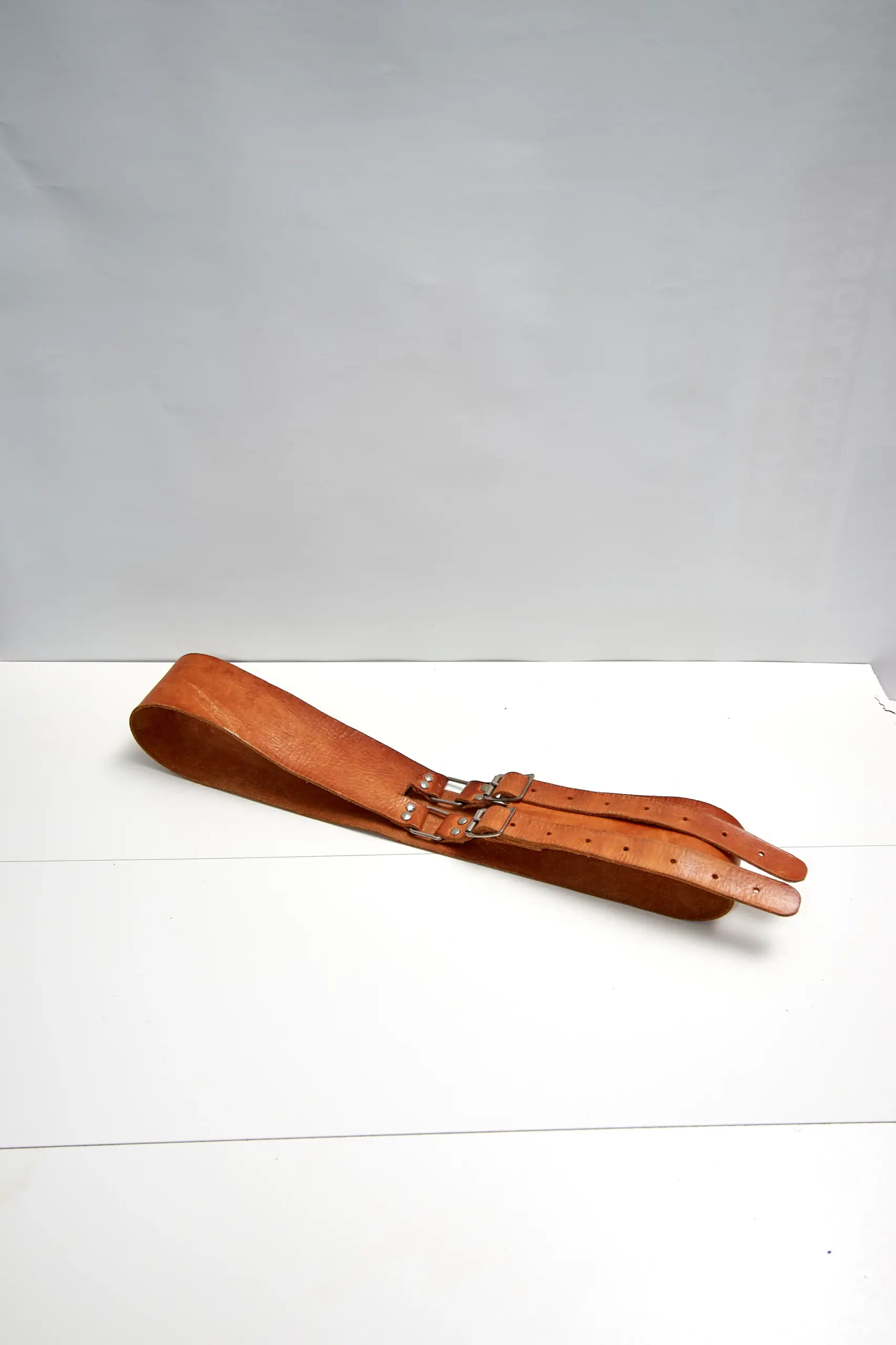 Centură din piele vintage cu închidere cu două cataramă și multiple găuri de ajustare. Lungime 110cm, 5,5cm lățime.