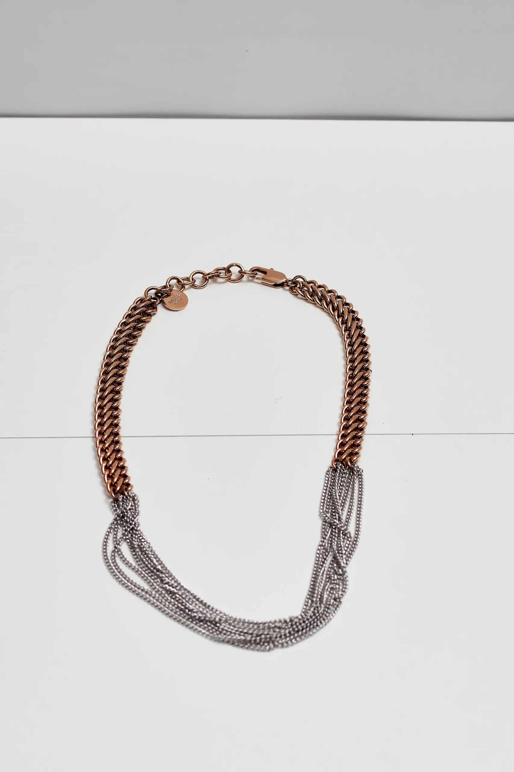 Colier statement de la casa de design daneză Dyrberg/Kern. Estetică „Scandi-cool”, care combină elemente clasice cu o notă modernă și îndrăzneață. Lungime de 46 cm.