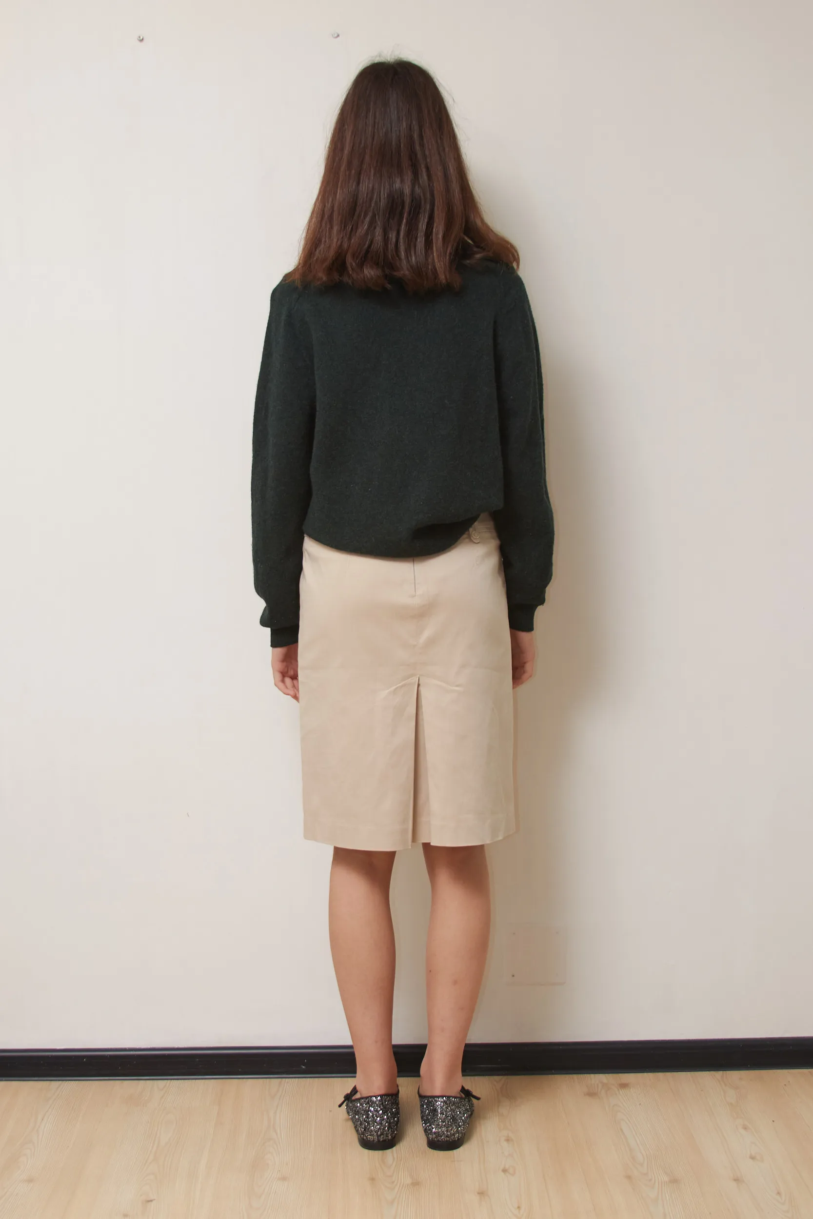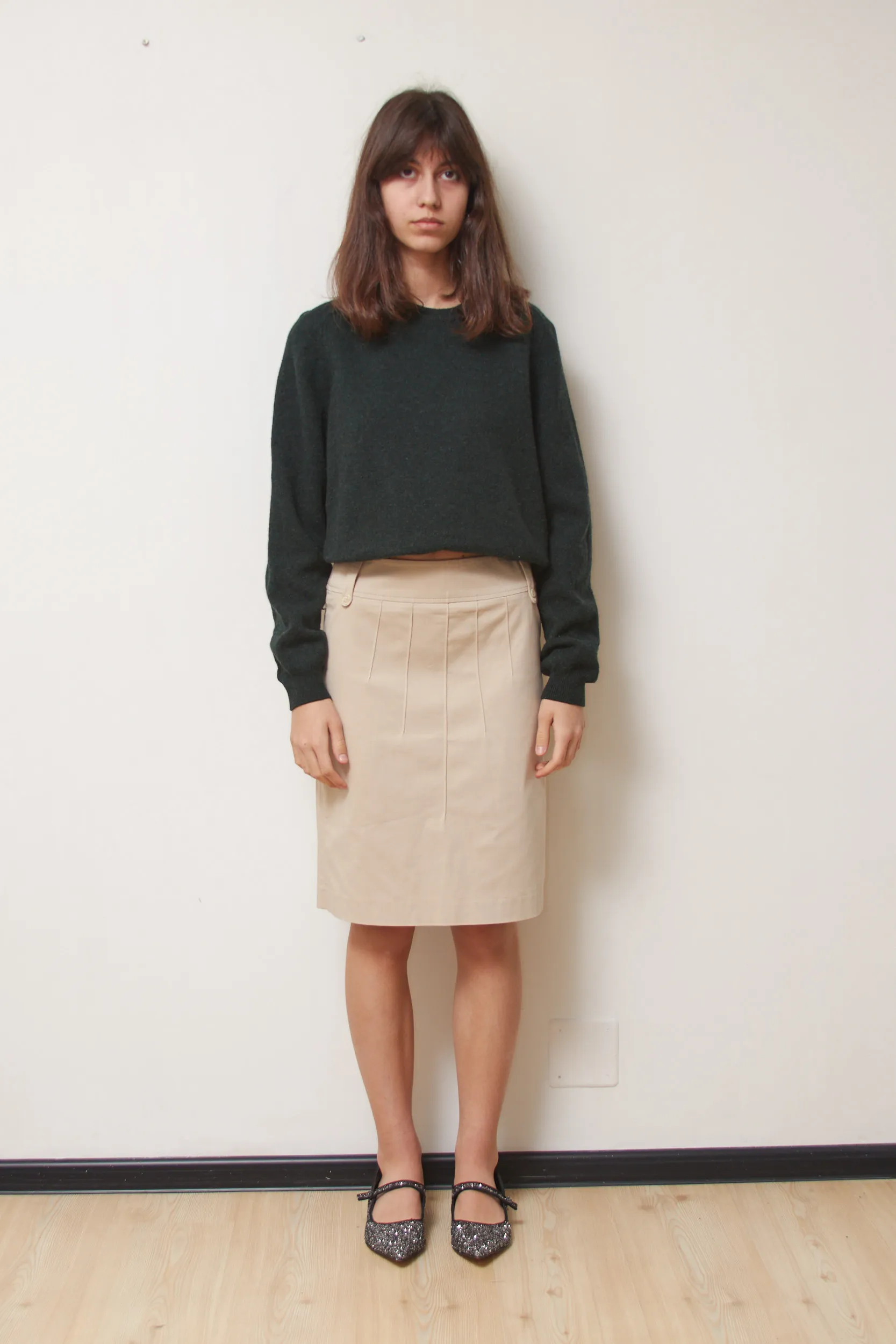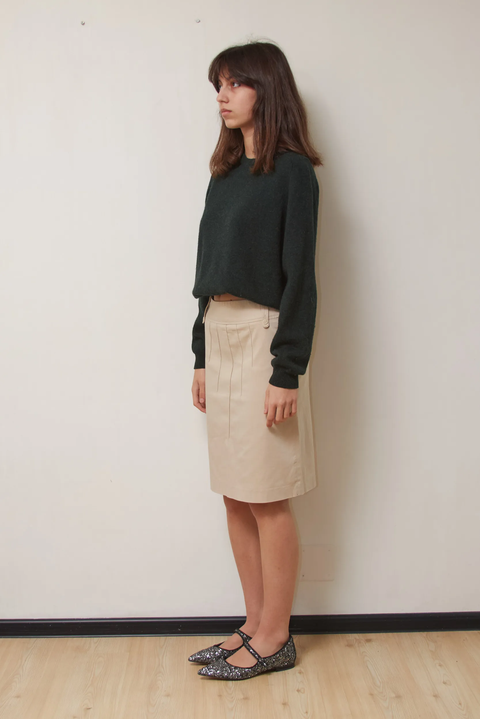 Croială în A, până la genunchi. Se remarcă prin cusăturile verticale decorative care alungesc vizual silueta. Talia este marcată de găici late, accesorizate cu nasturi. Are închidere cu fermoar ascuns la spate și un șliț central la bază, esențial pentru libertatea de mișcare.