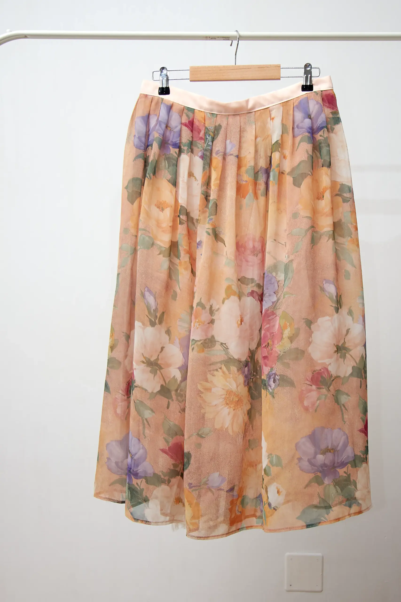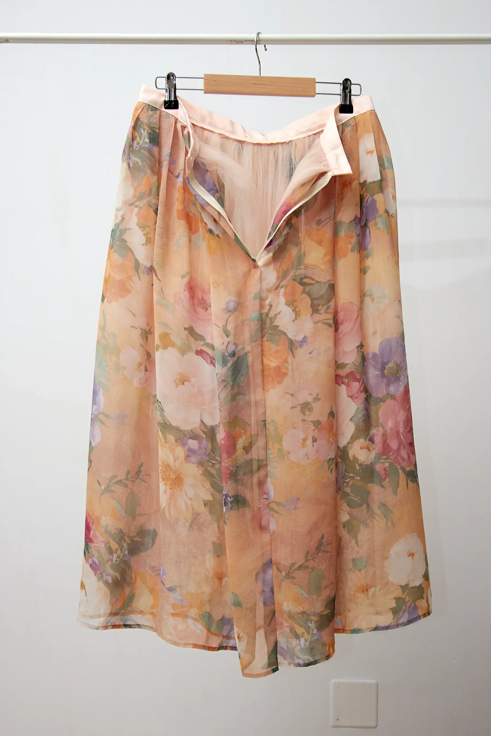 Fustă vintage cu imprimeu floral și căptușeală de tulle. Lipsă etichetă de compoziție. Talie 82cm, lungime 83cm.
