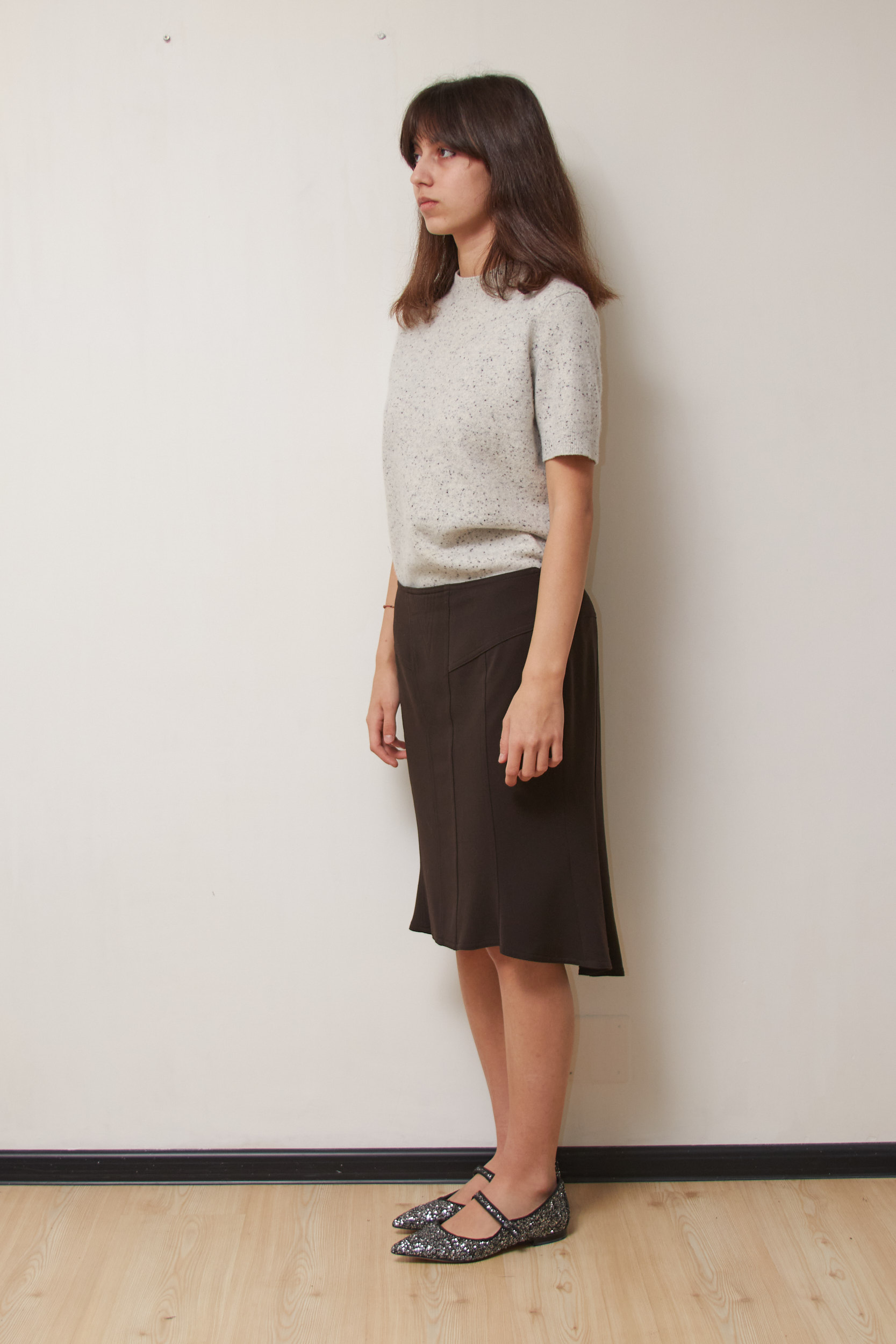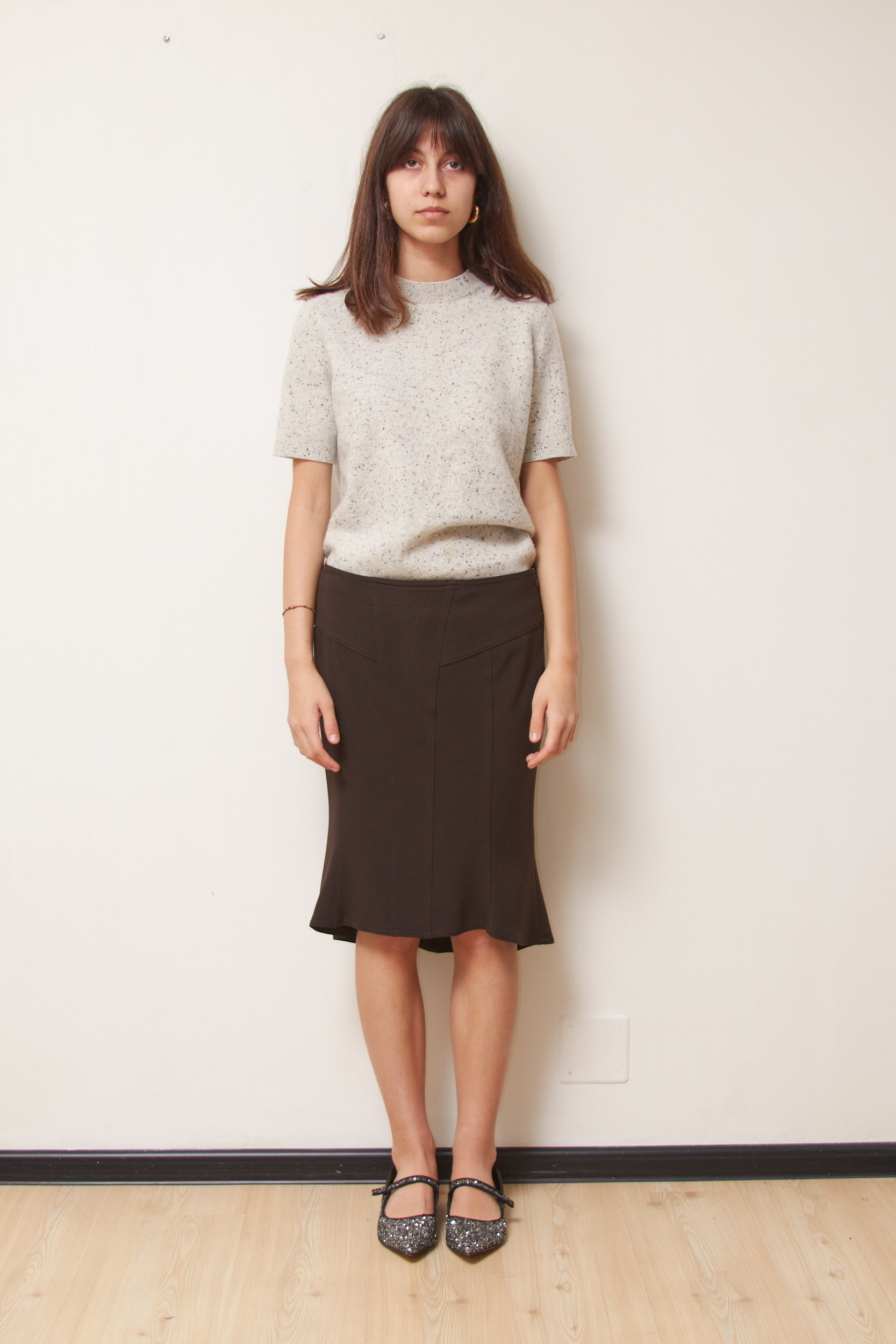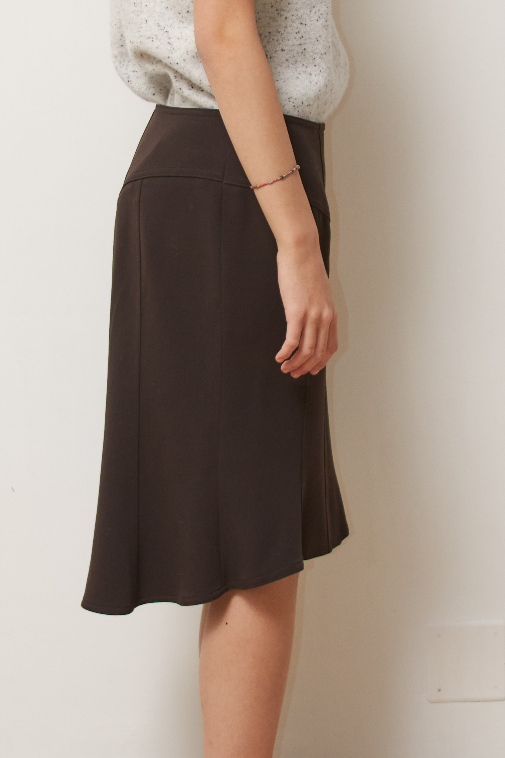 O piesă de o eleganță discretă, această fustă de la Exe Italia impresionează prin precizia croielii și fluiditatea materialului. Elementul distinctiv este terminația asimetrică de tip „mermaid” sau „trumpet”, care oferă volum și un joc spectaculos de mișcare la fiecare pas. Talia înaltă, marcată printr-o cusătură în formă de „V” la spate, flatează zona lombară și oferă o așezare impecabilă.