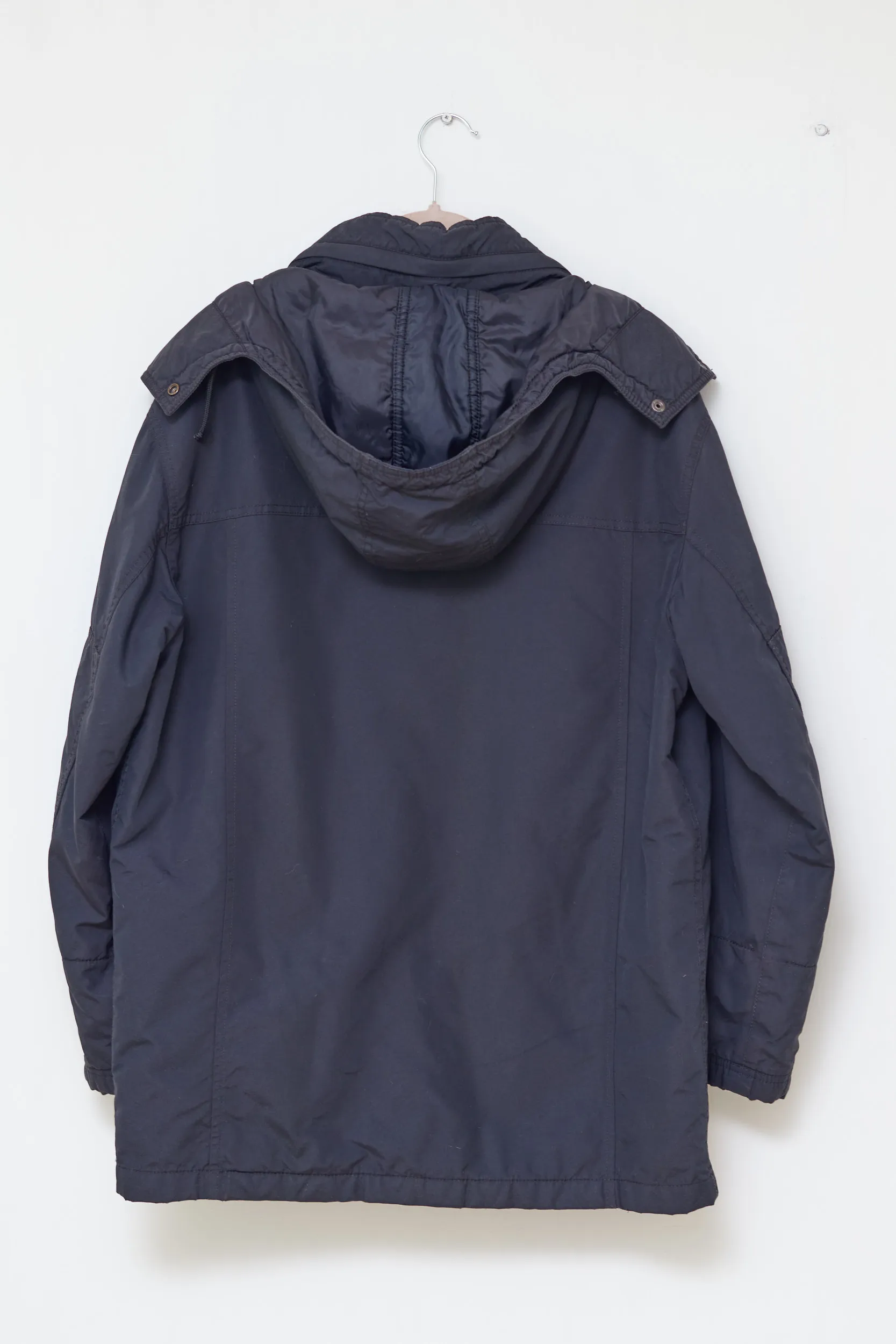 Această geacă Fay Stadium combină funcționalitatea robustă cu eleganța discretă, specifică grupului Tod’s. Confecționată dintr-un material tehnic dens, rezistent la vânt și uzură, geaca este gândită pentru a face față sezonului rece cu stil. Interiorul are o căptușeală matlasată care oferă o izolație termică excelentă, fără a fi voluminoasă. Designul utilitar include multiple buzunare ample (stil „Cargo”), glugă protectoare și un sistem dublu de închidere (fermoar + capse + cârlig) pentru o protecție maximă. Semnătură: Cârlig metalic („Gancio”) la guler + Logo brodat pe eticheta interioară și nasturi.