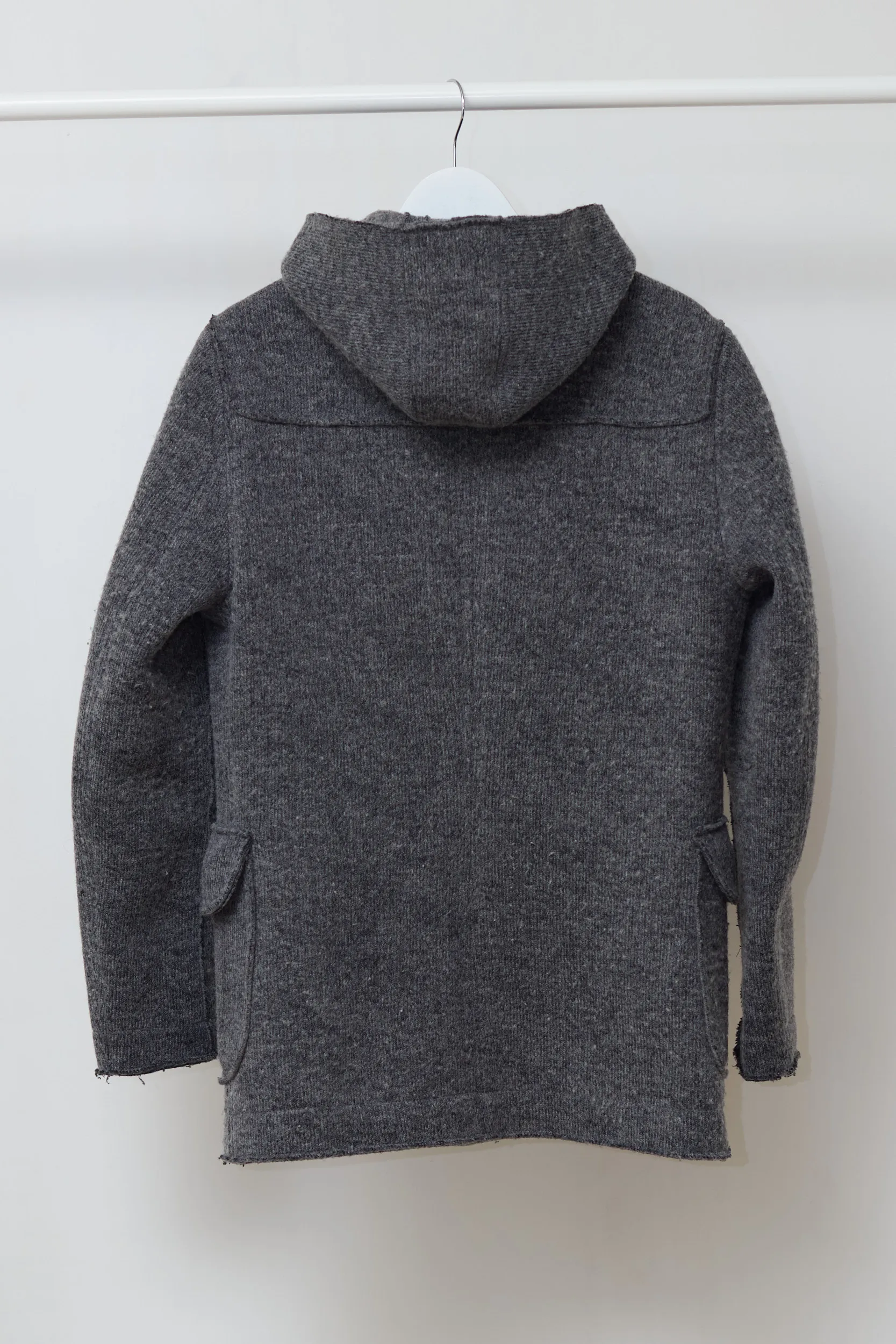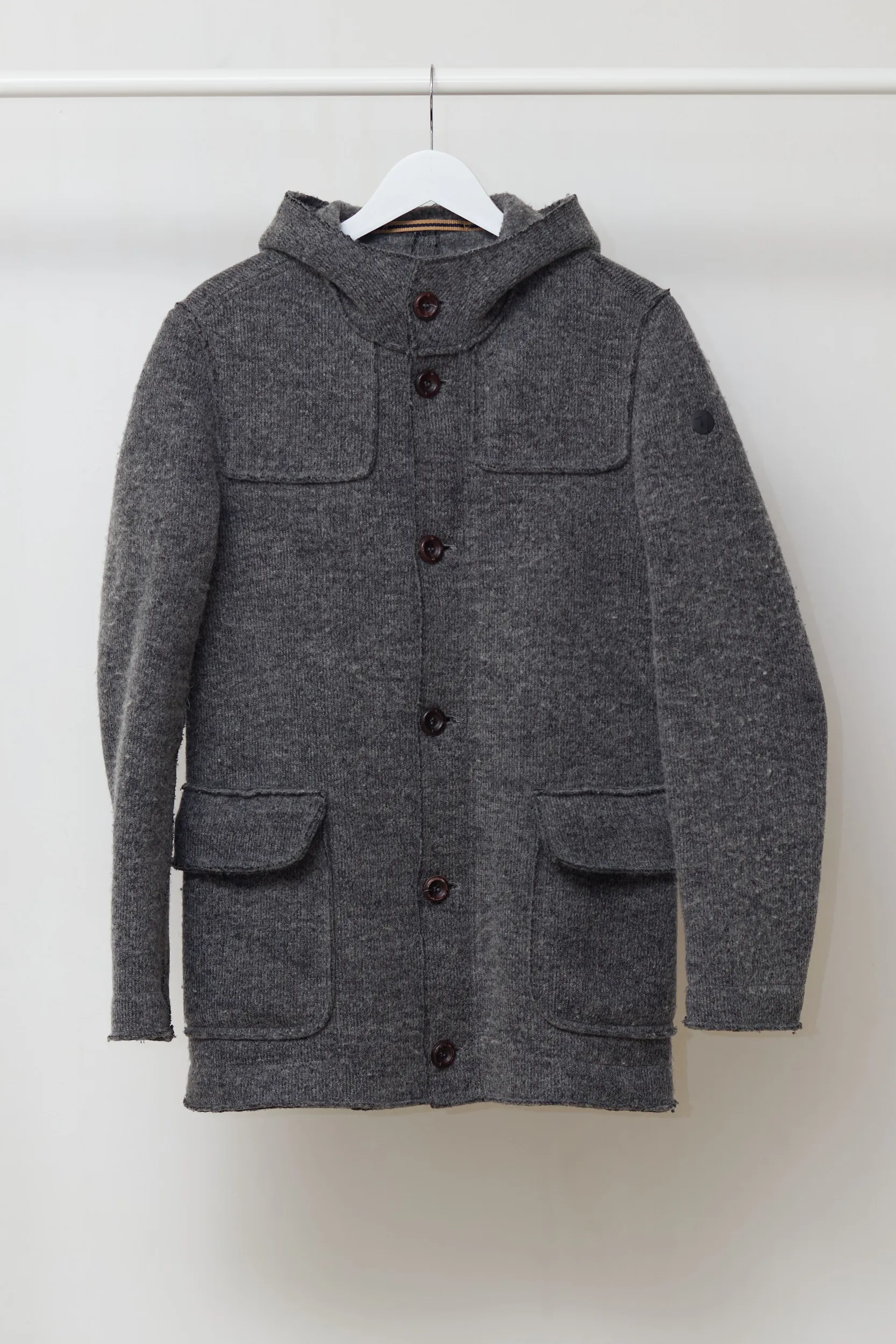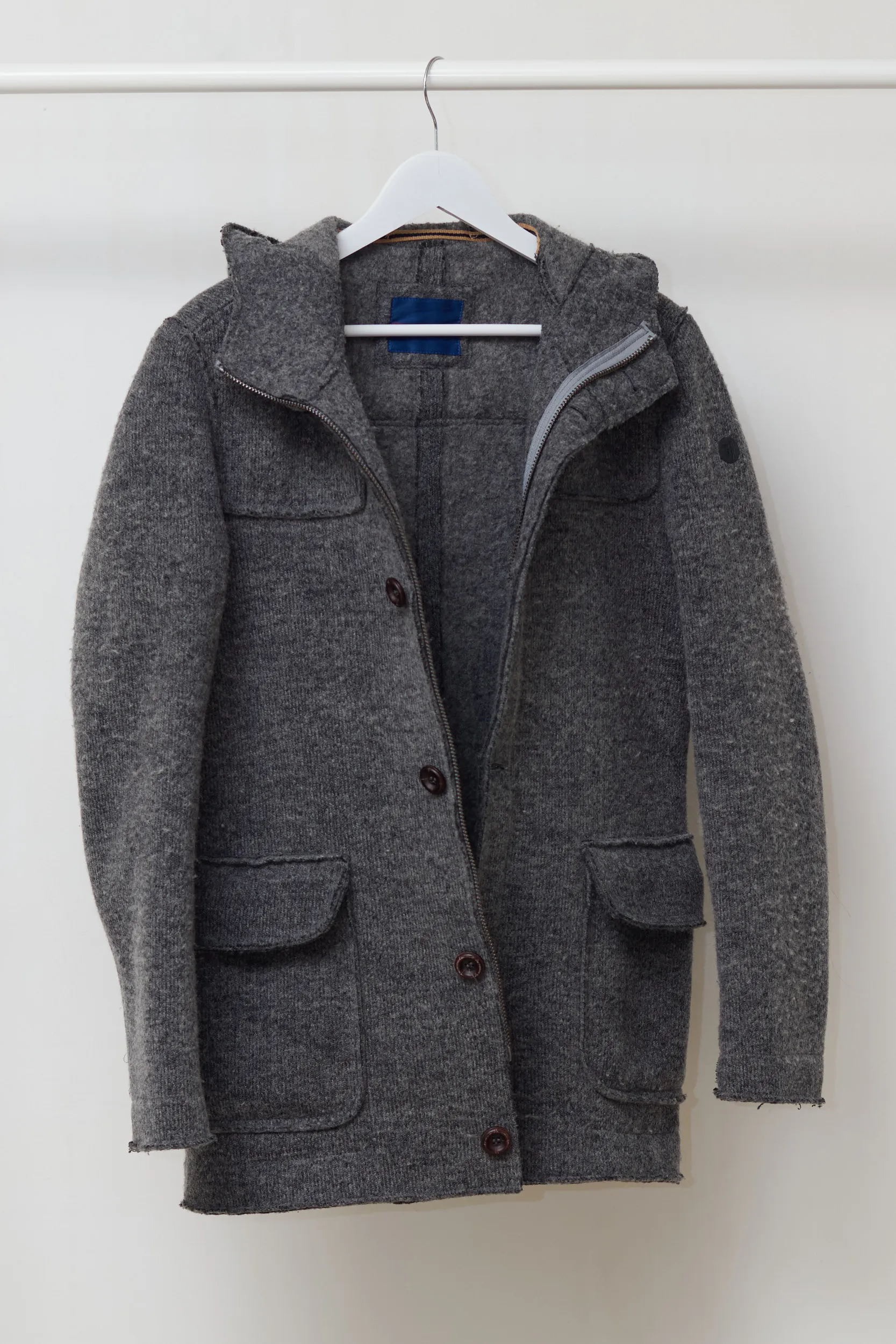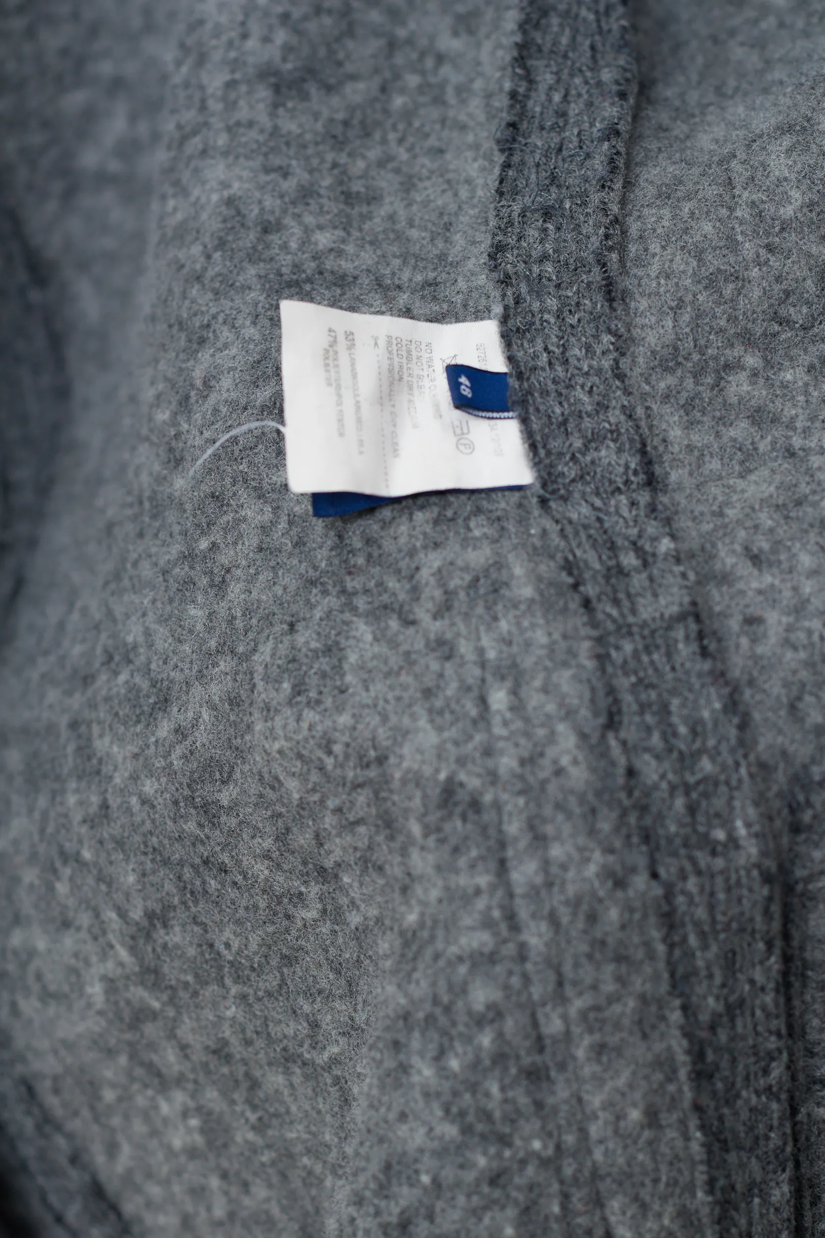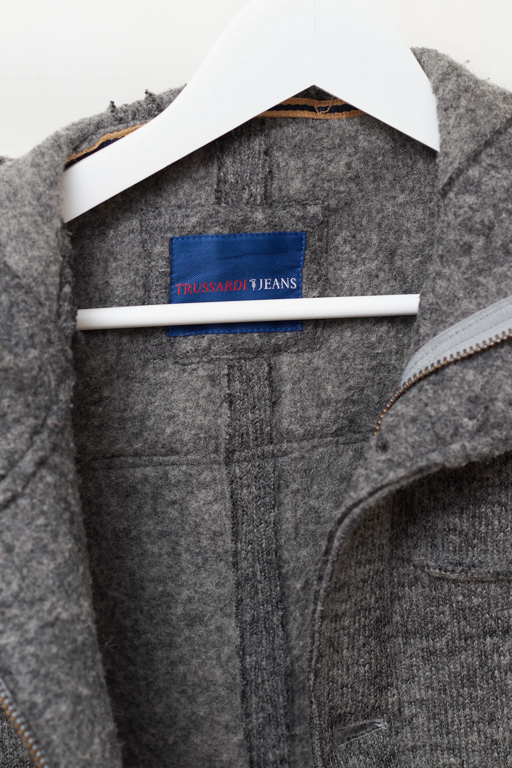 Căldură și structură. Această jachetă de la Trussardi Jeans combină confortul tricotajelor cu protecția unei geci. Realizată dintr-un amestec dens de lână virgină cu aspect de „lână fiartă”. Țesătura este un amestec de 53% Lână Virgină și 47% Poliester. Lâna virgină asigură izolația termică superioară, în timp ce poliesterul oferă structură, împiedicând jacheta să își piardă forma în timp. Textura este aspră, gri melanj, specifică stilului outdoor. Are un sistem de închidere dublu: fermoar metalic interior + nasturi exteriori. Acest detaliu este excelent pentru izolarea împotriva vântului.
