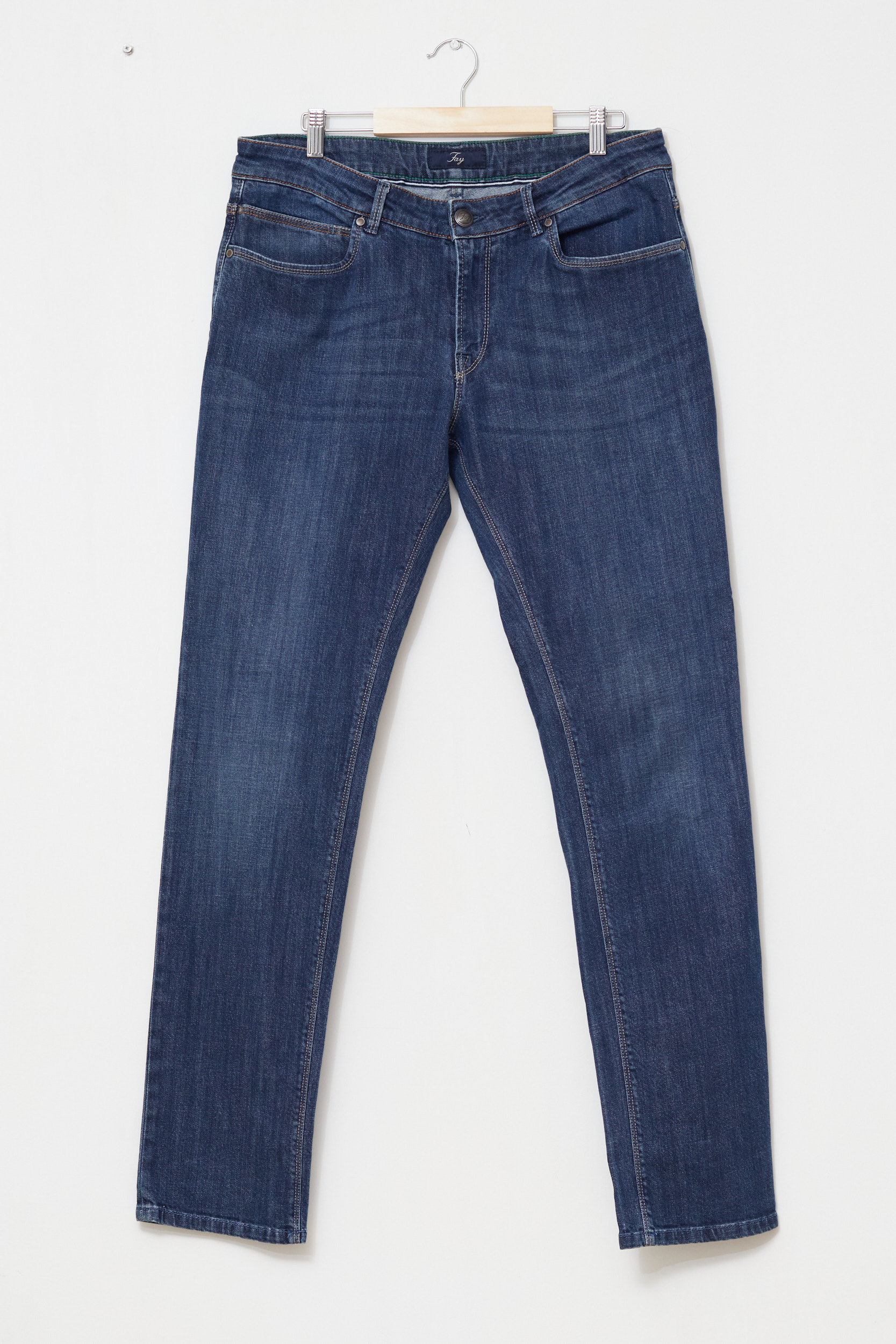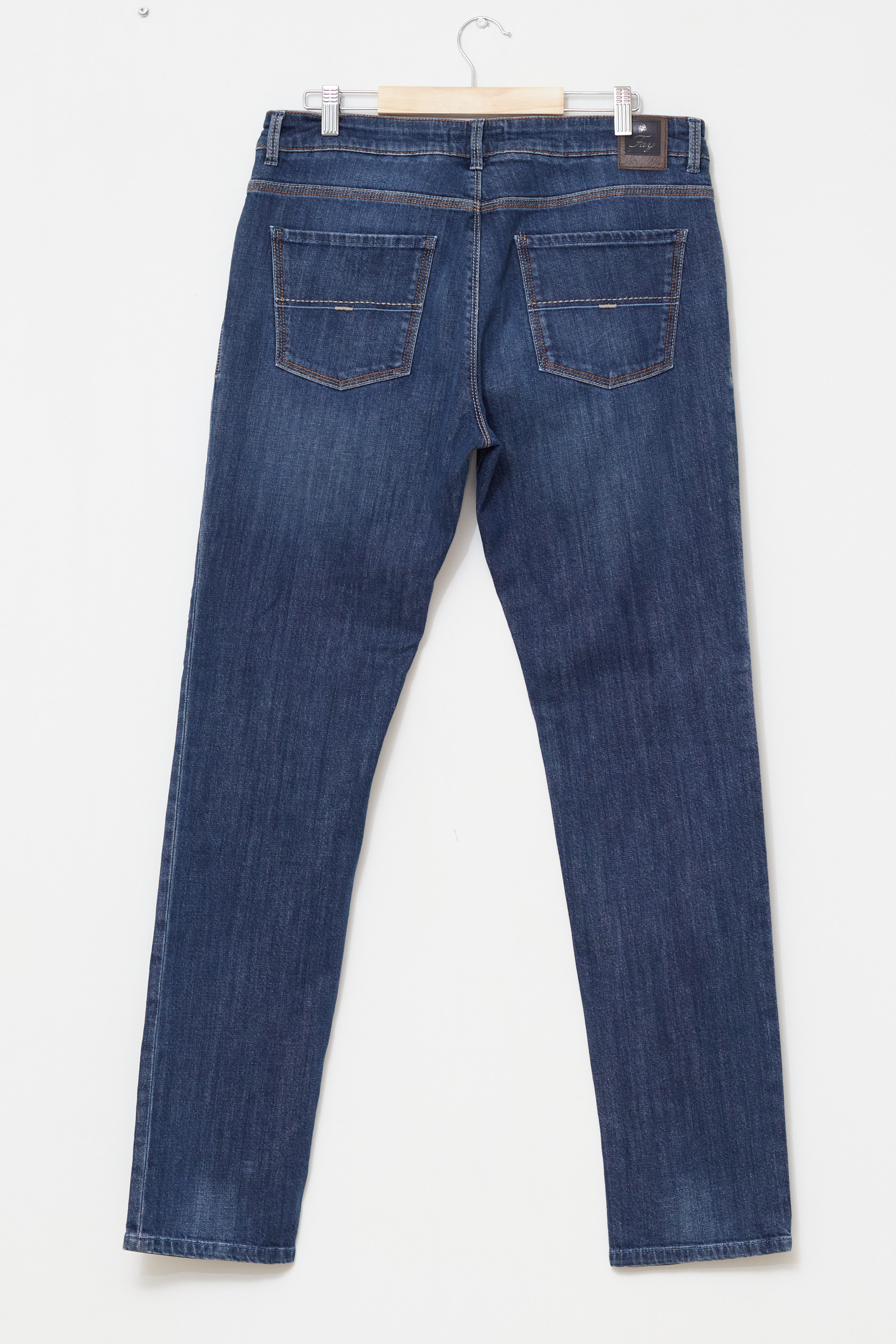 Confecționați dintr-un denim premium cu 99% Bumbac și 1% Elastan, acești pantaloni oferă structura clasică a blugului, dar cu suficientă elasticitate pentru a fi comozi la condus sau stat pe scaun. Culoarea este un albastru profund, cu o ușoară patină naturală („fading”) în zonele cheie. Detaliile fac diferența: cusăturile contrastante (portocaliu/verde discret la betelie), logo-ul „Fay” brodat pe buzunarul mic și patch-ul din piele maro de la spate cu logo embosat. Buzunarele din spate au cusătura semnătură a brandului.