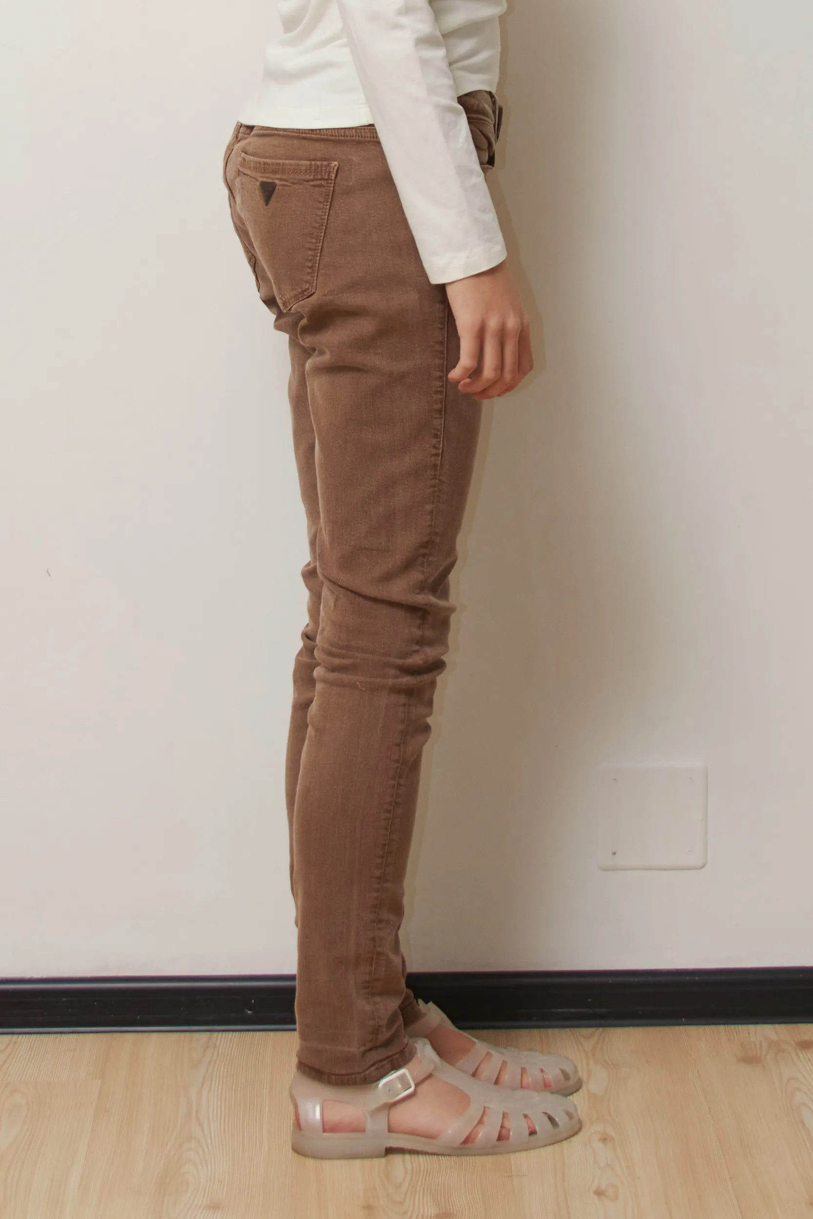 Realizați într-o nuanță versatilă de taupe/maro prăfuit, acești pantaloni se remarcă prin textura lor moale, ușor satinată, patch de piele cu imprimeu leopard la spate și logo-ul metalic triunghiular Guess aplicat pe buzunar.