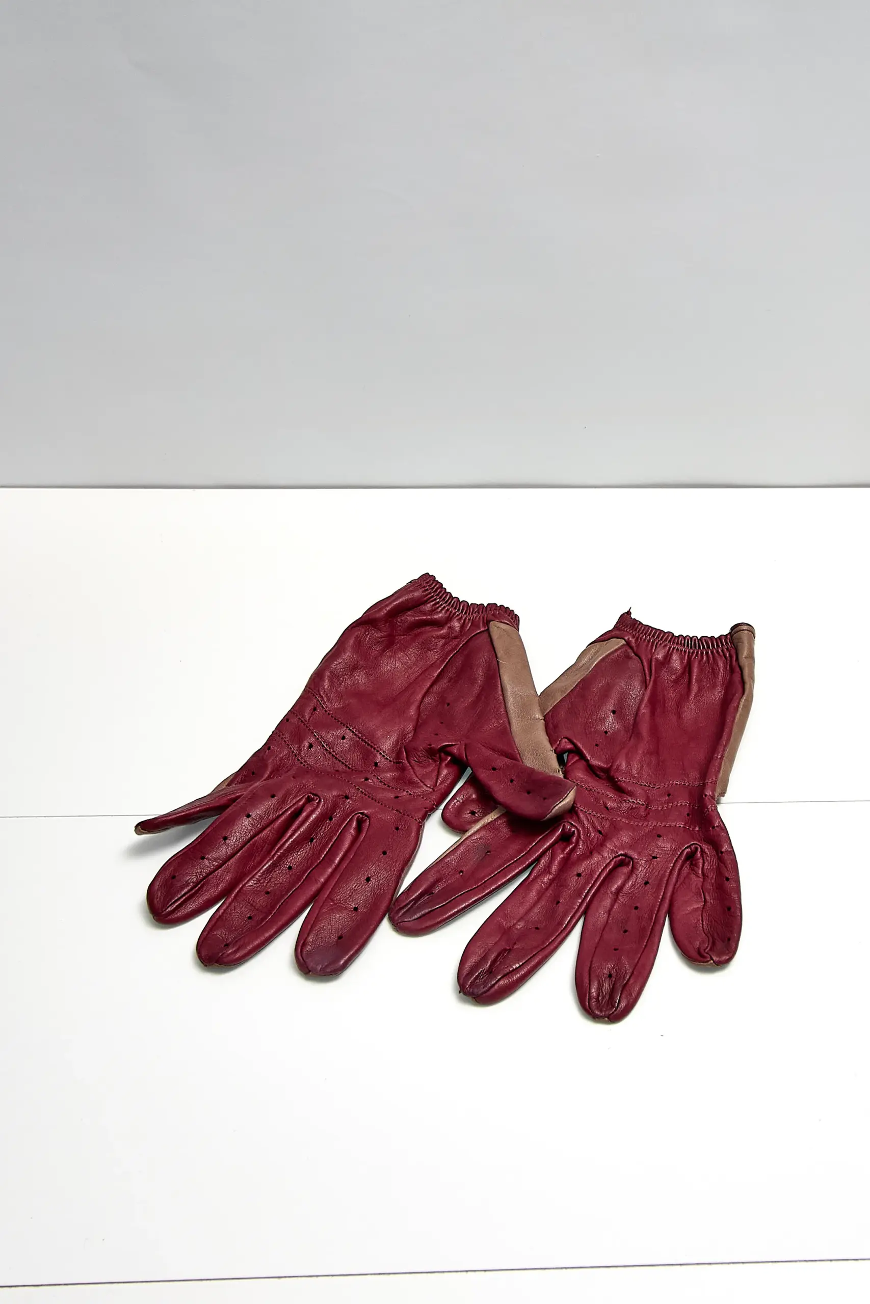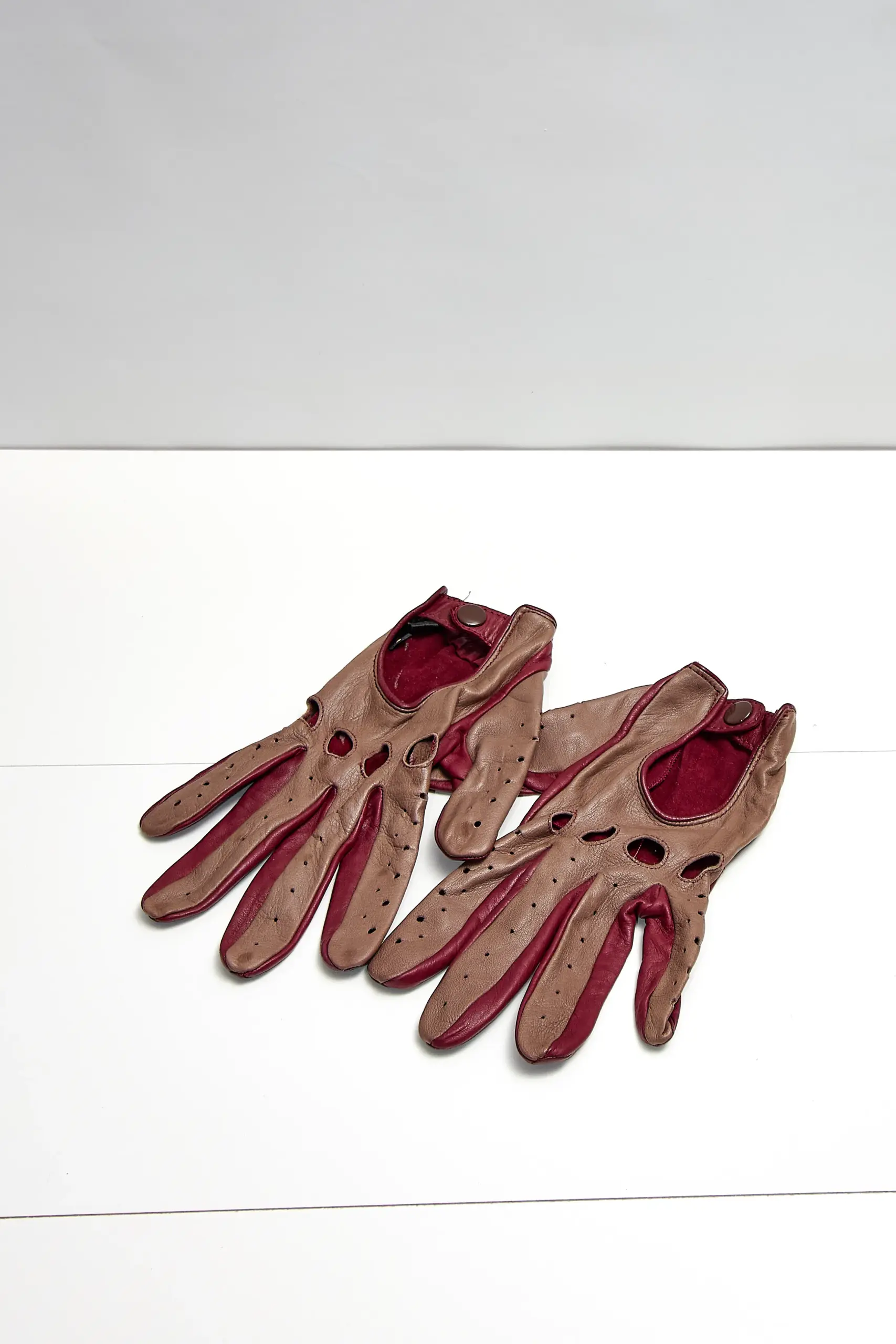 Mănuși de condus din piele, Burgund și Bej, perforate, închidere cu nasturi.