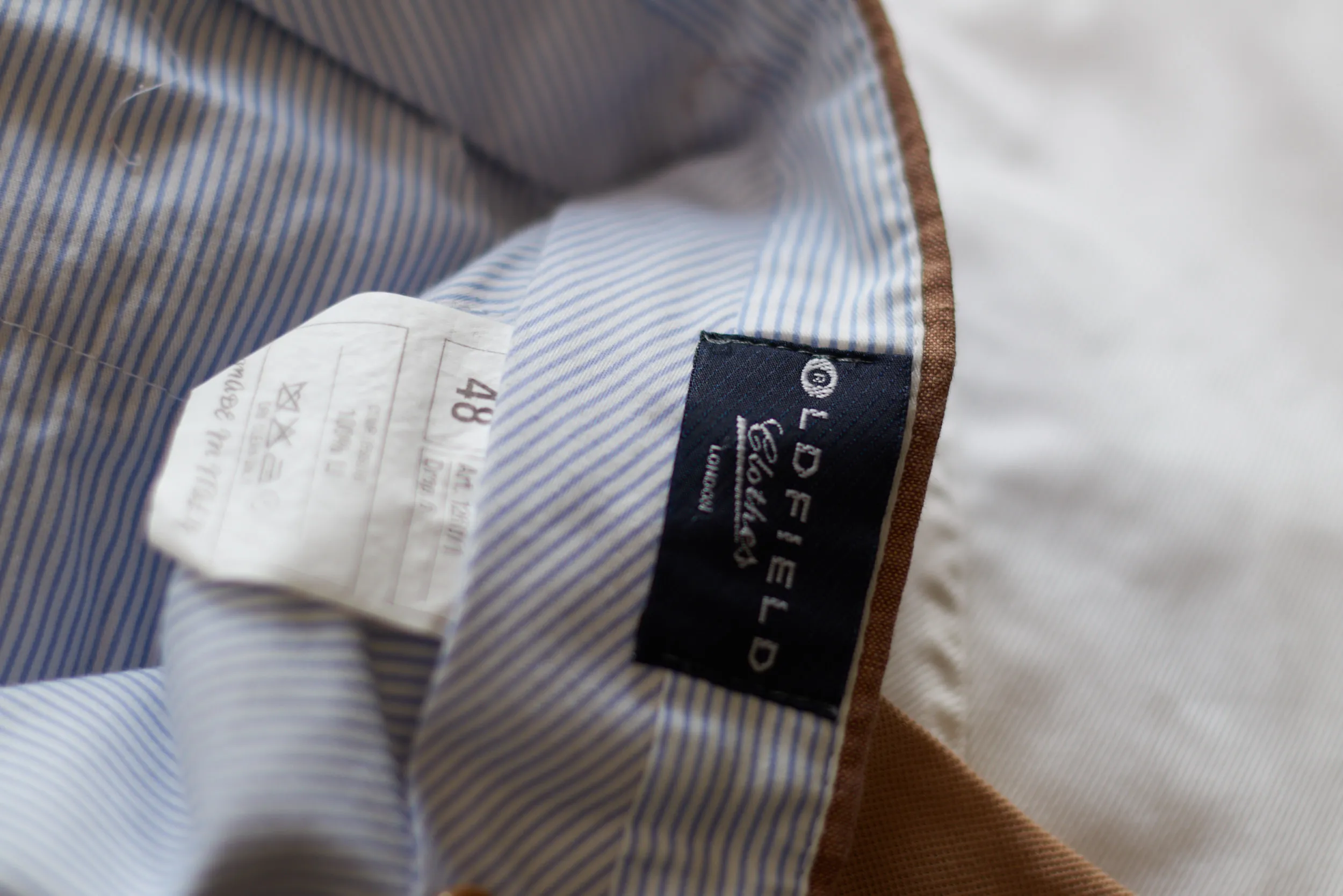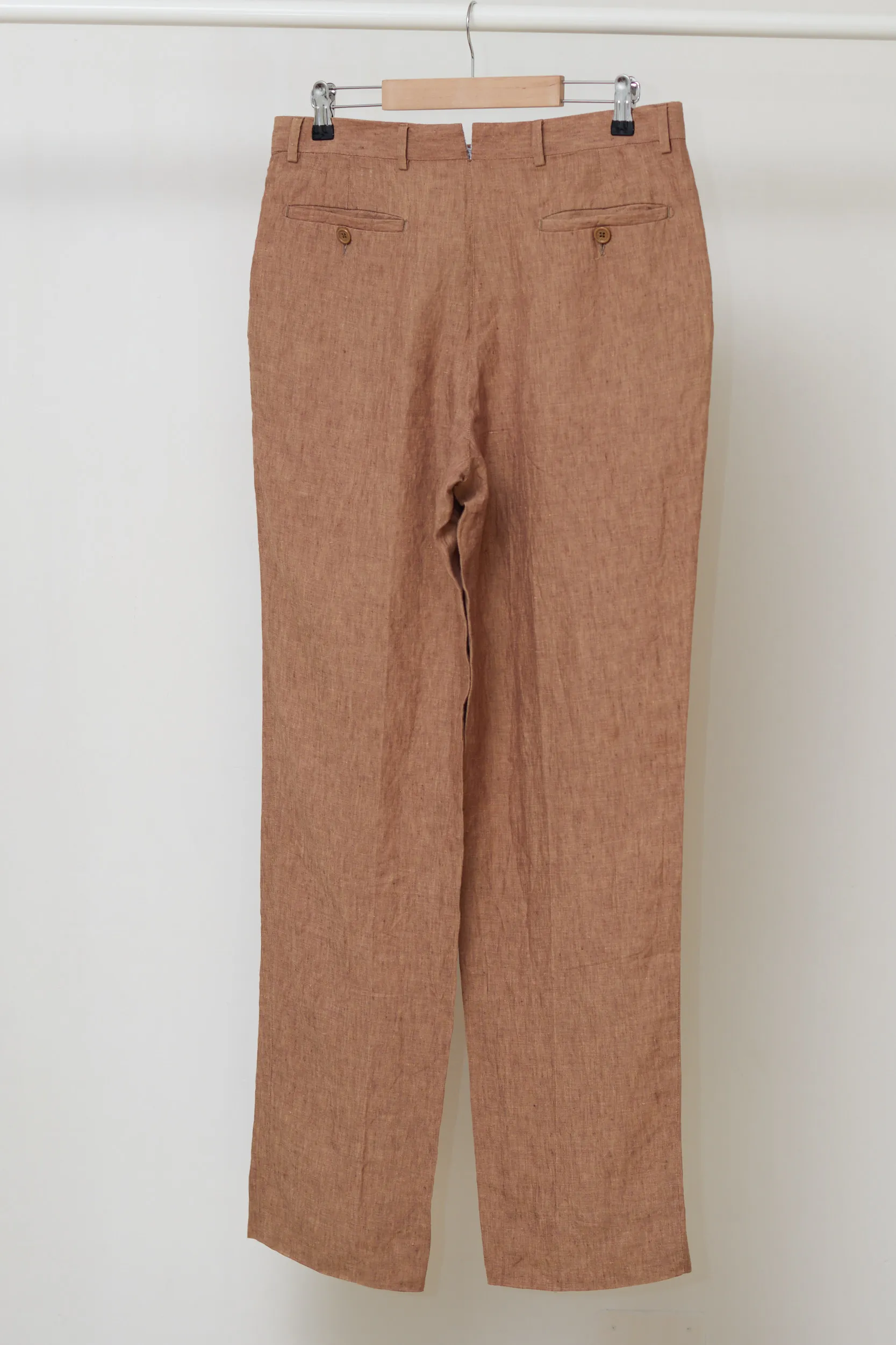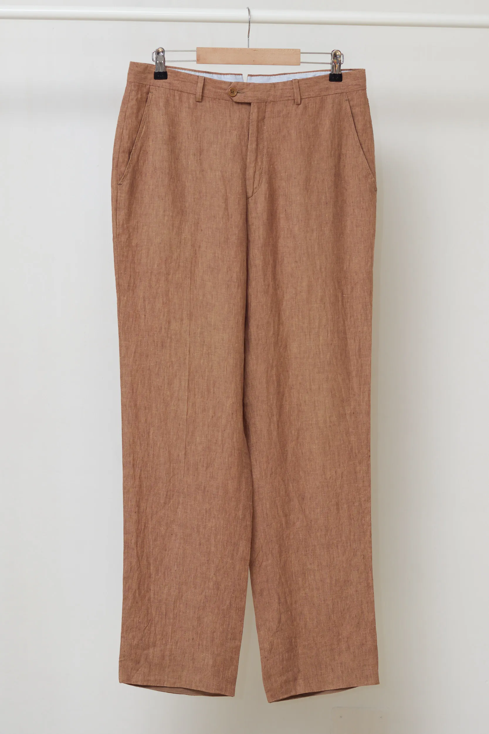Acești pantaloni din in de la Oldfield Clothes London sunt esența stilului „Gentleman de vară”. Realizați în Italia din 100% in natural, într-o nuanță superbă de tabac. Textura este aerisită, ușoară și are acel aspect natural, ușor șifonat, specific eleganței relaxate. Drop 6″ de pe etichetă indică o croială standard (Regular Fit), nu foarte strâmtă, ideală pentru in, care trebuie să stea lejer pe piele.