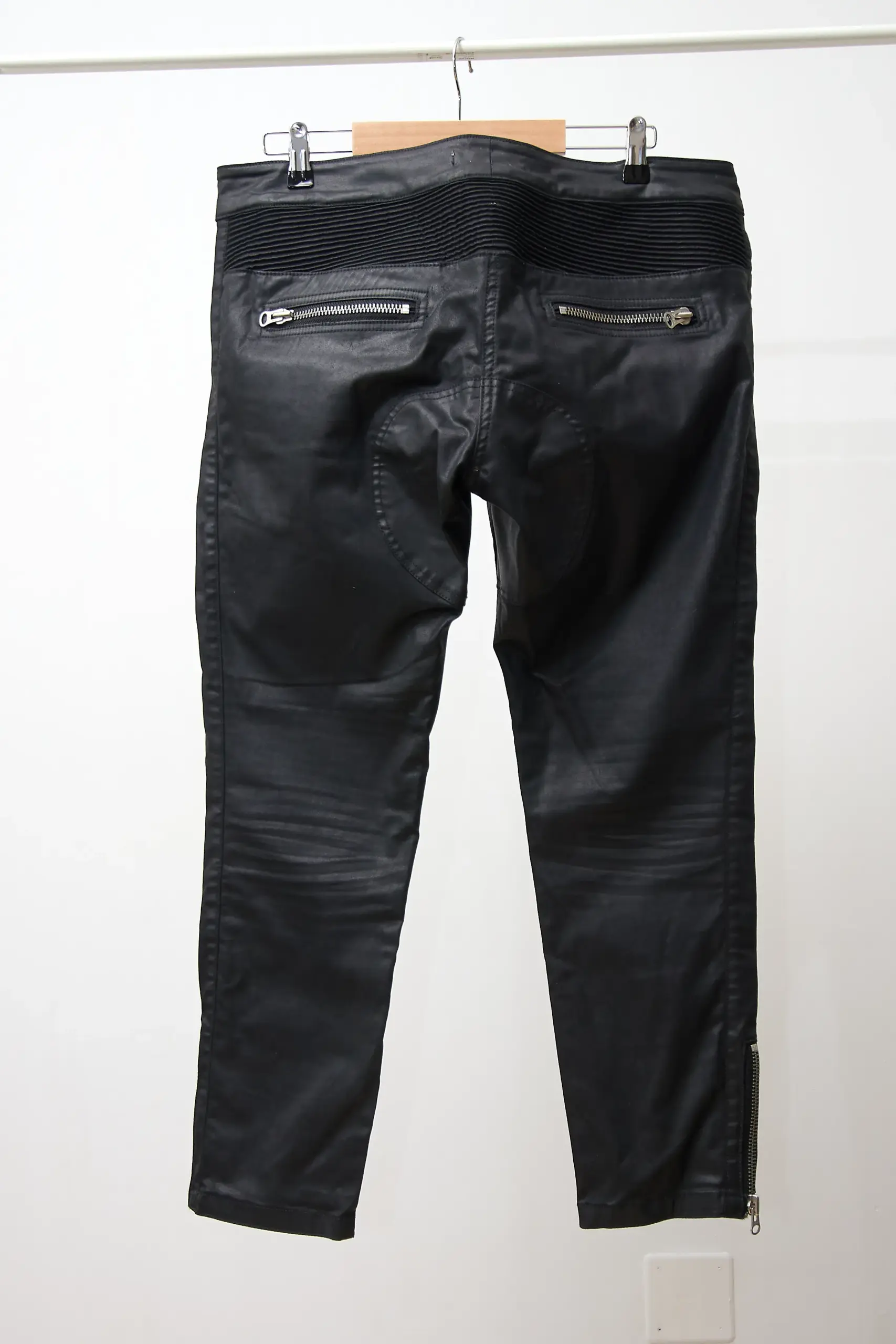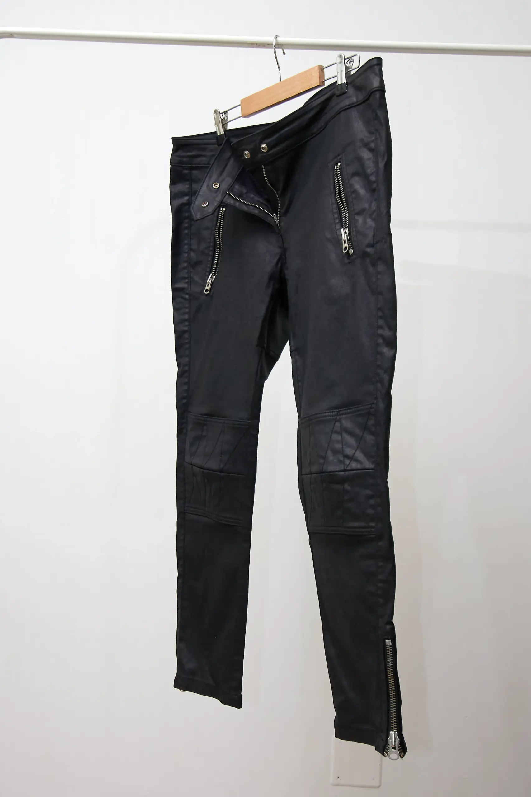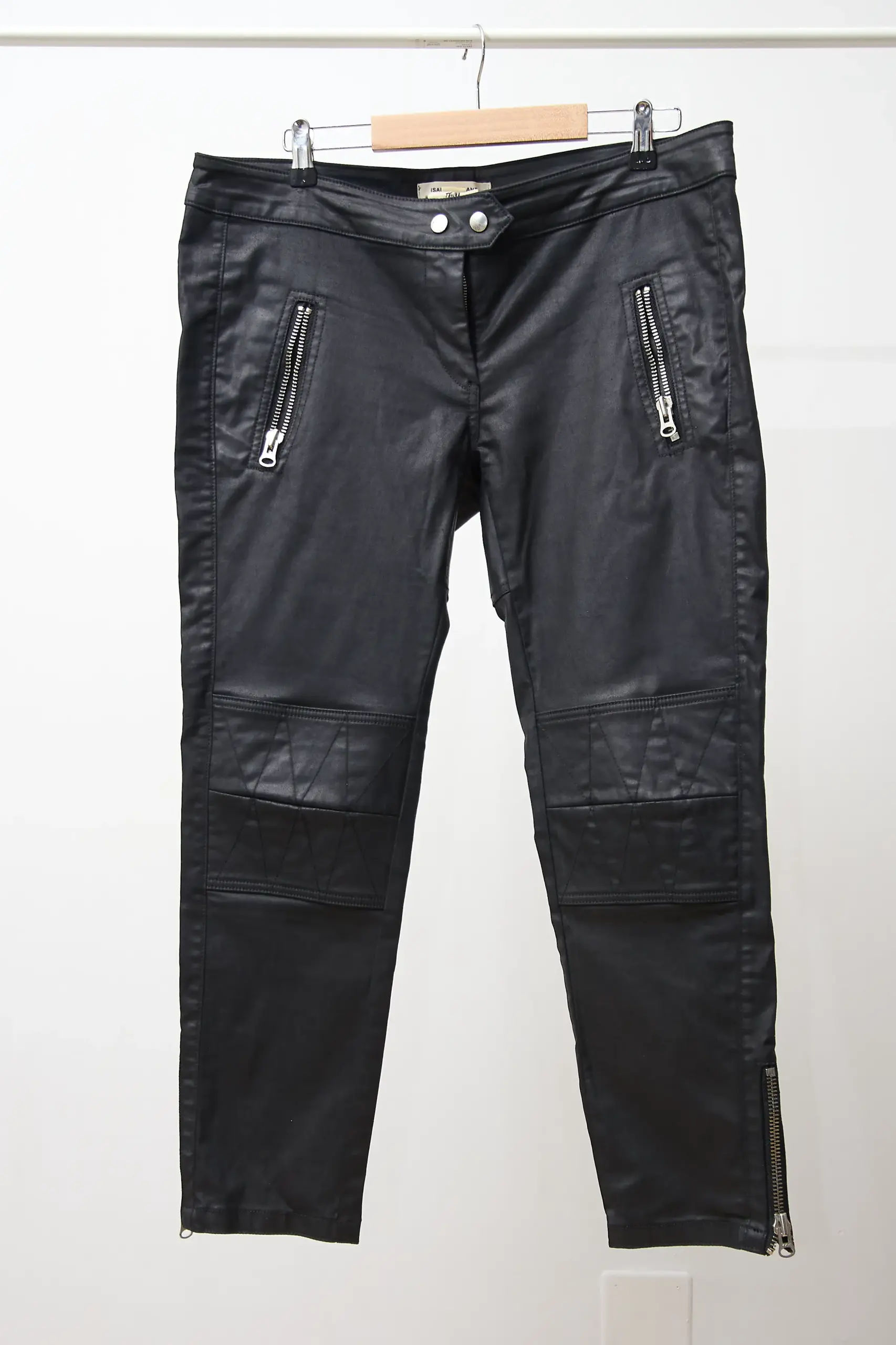 Pantaloni moto cu talie joasă din bumbac cerat, din colecția Isabel Marant x H&M, lungime 90cm, talie 96cm. 97% bumbac, 3% elastan.