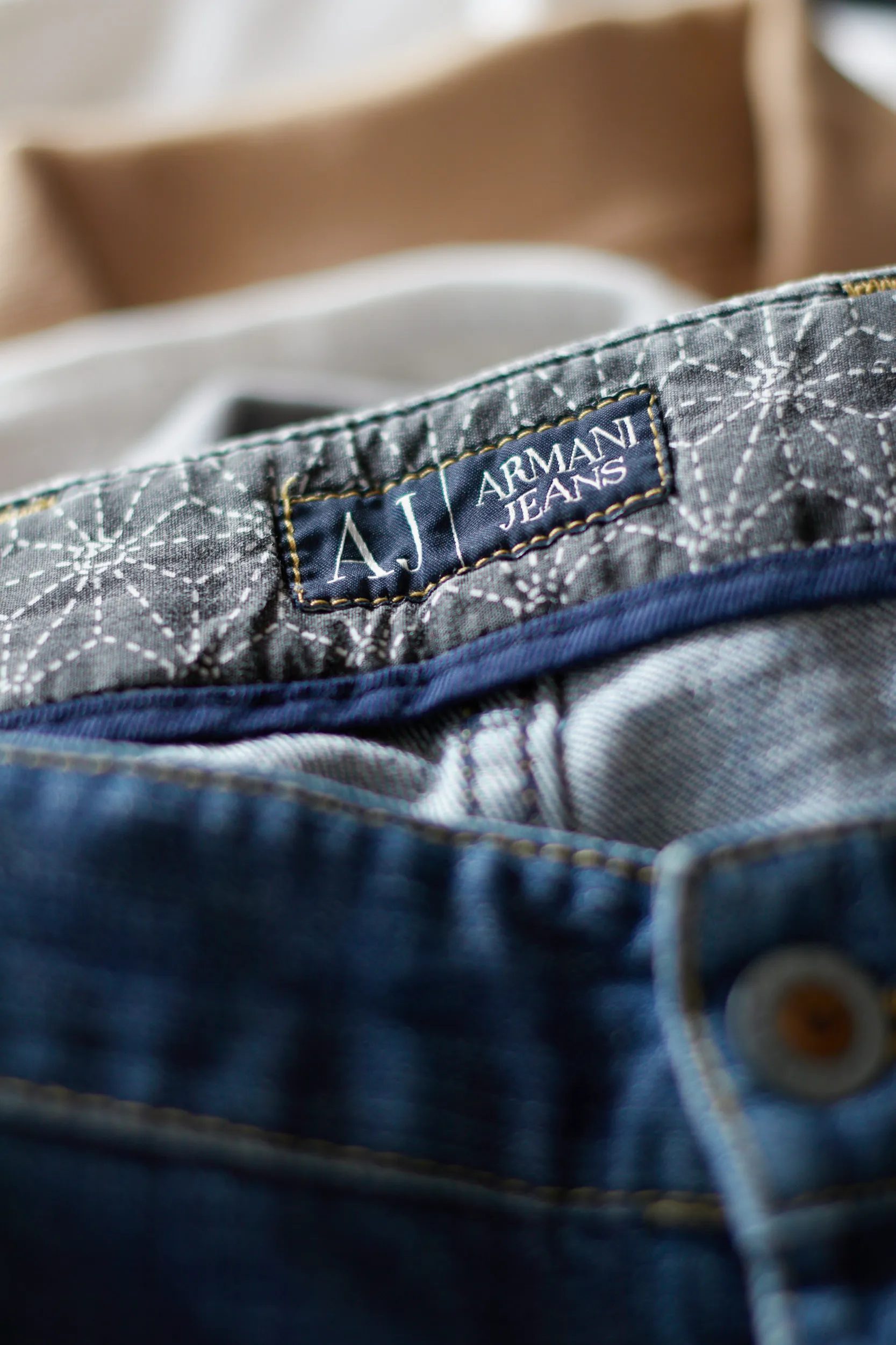 Patch din piele maro cu inscripția „AJ | ARMANI JEANS” pe betelia din spate.
