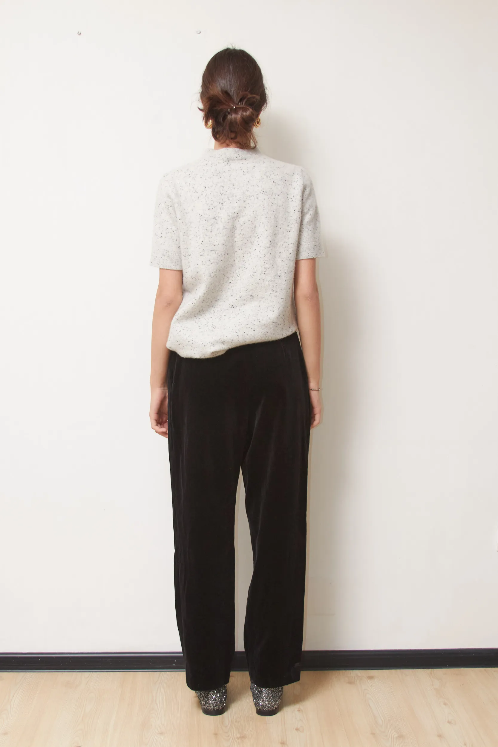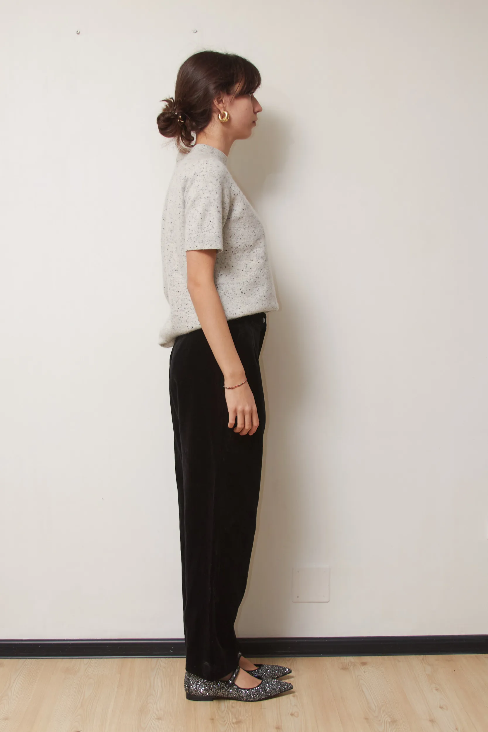 Această pereche de pantaloni este o piesă rară de colecție, provenind de la prestigioasa casă de modă italiană Luisa Spagnoli. Fac parte din linia „Elegantia”, fiind fabricați manual în Italia (Made in Italy) dintr-o catifea corduroy extrem de fină și densă. Croiala este una clasică, cu talie înaltă și pense frontale care oferă un volum elegant și o siluetă atemporală. Nuanța de negru profund și textura catifelată îi fac ideali pentru ținute de seară rafinate sau pentru un look office sofisticat de iarnă.