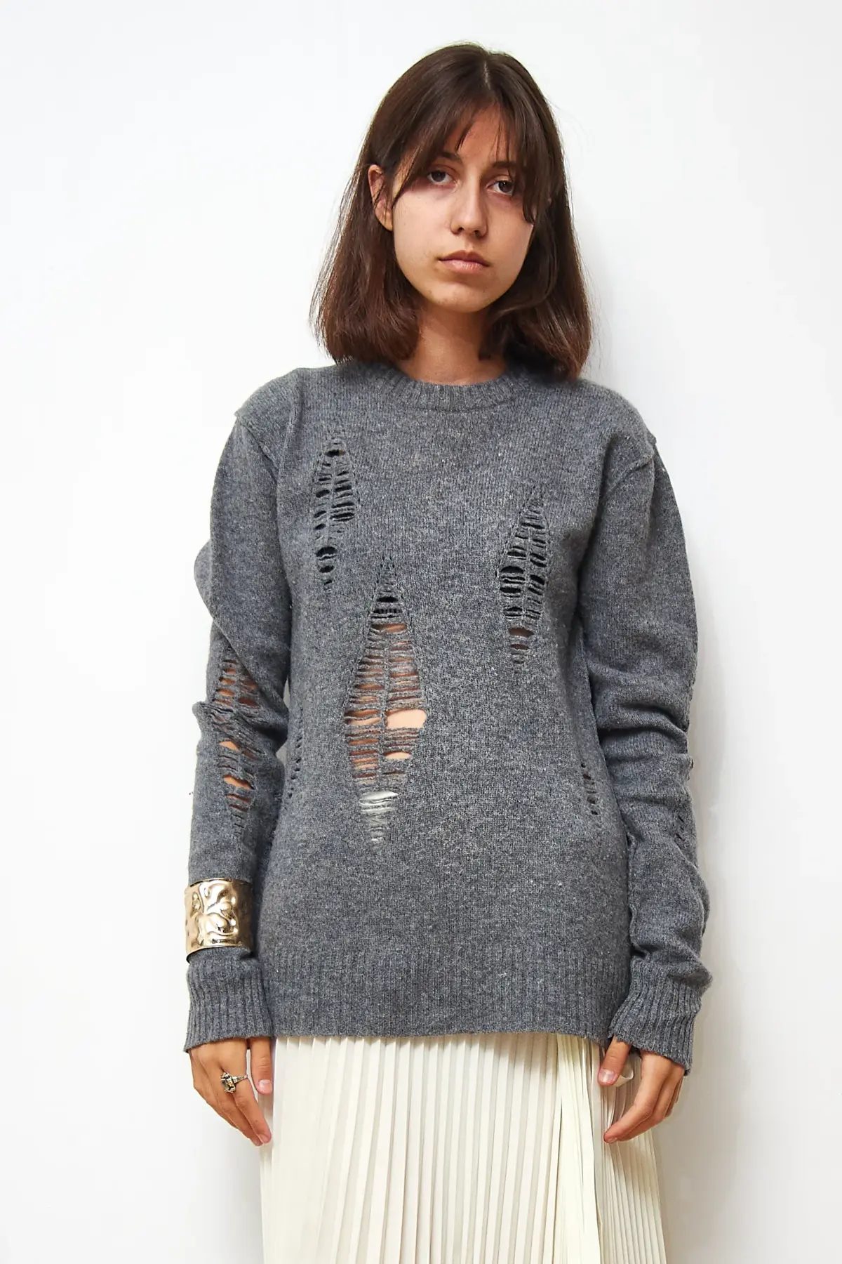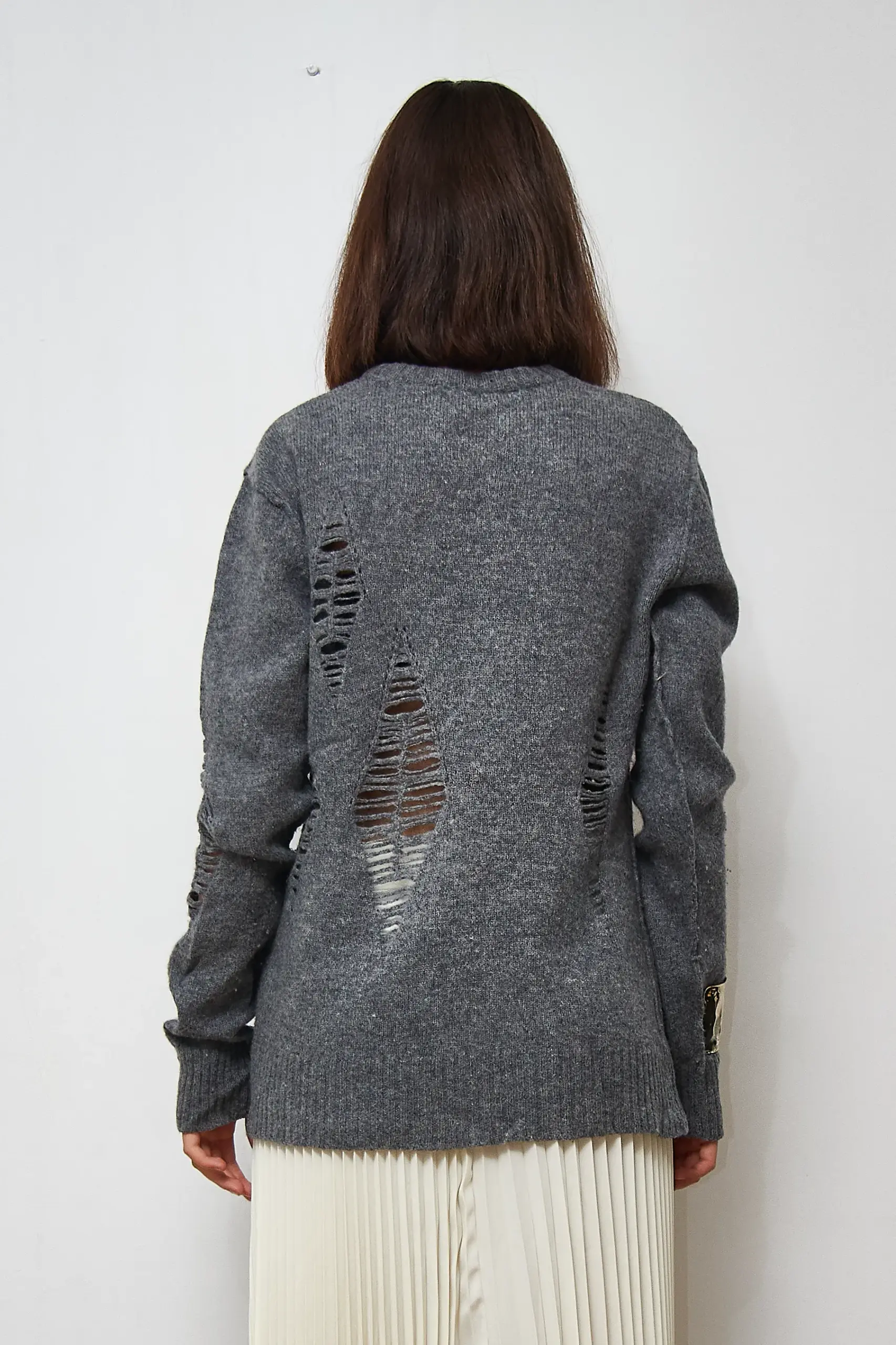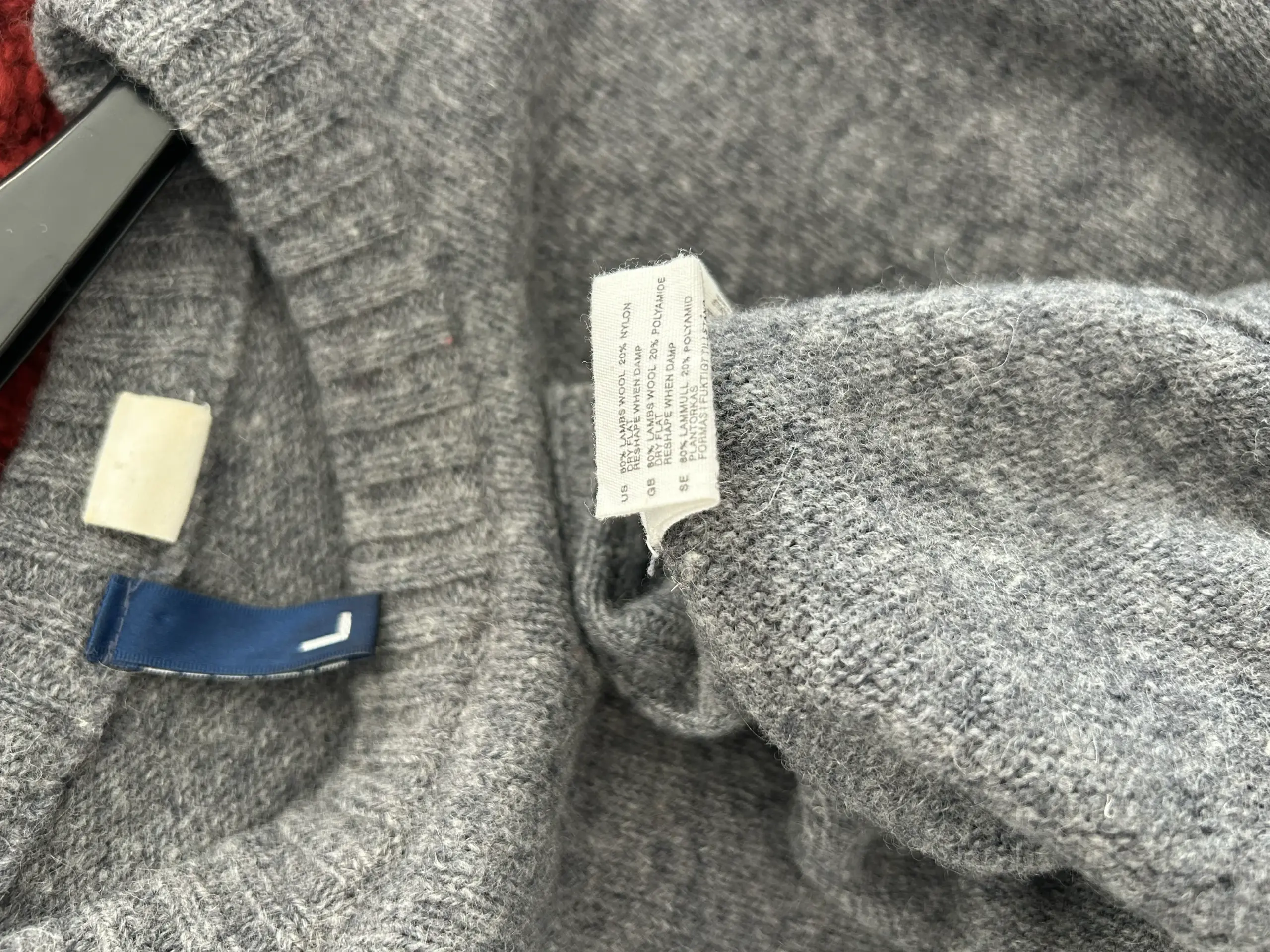 Pulover gri, 80% lână de miel, 20% poliamidă. Lungime 66cm.