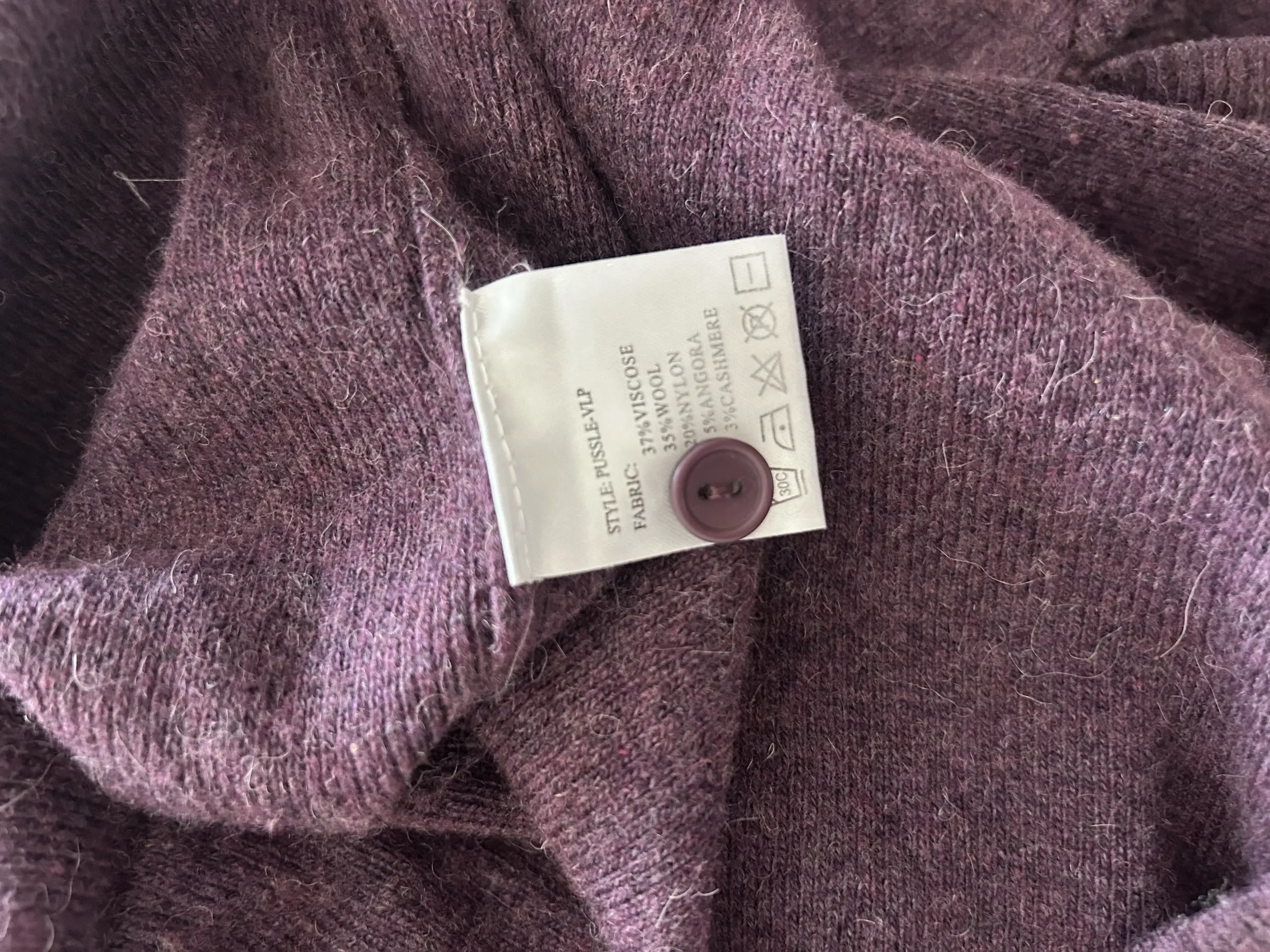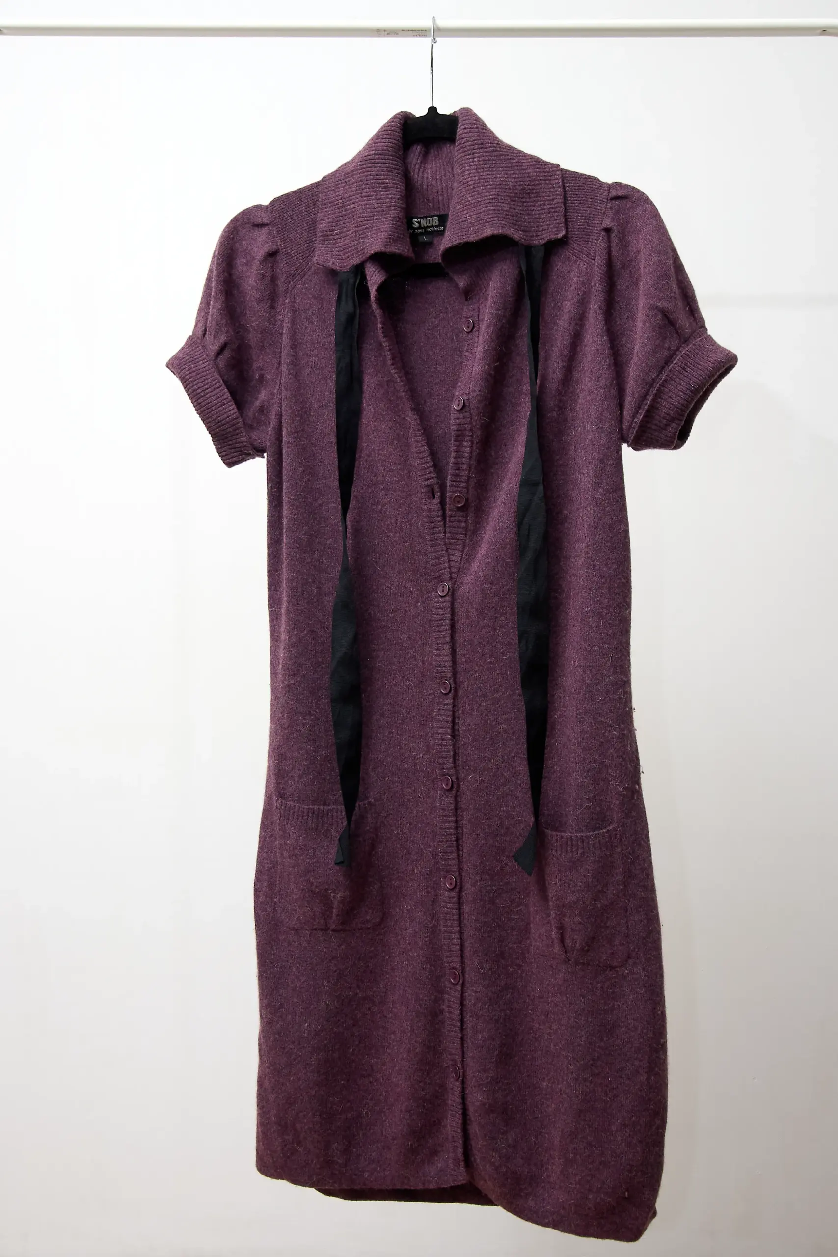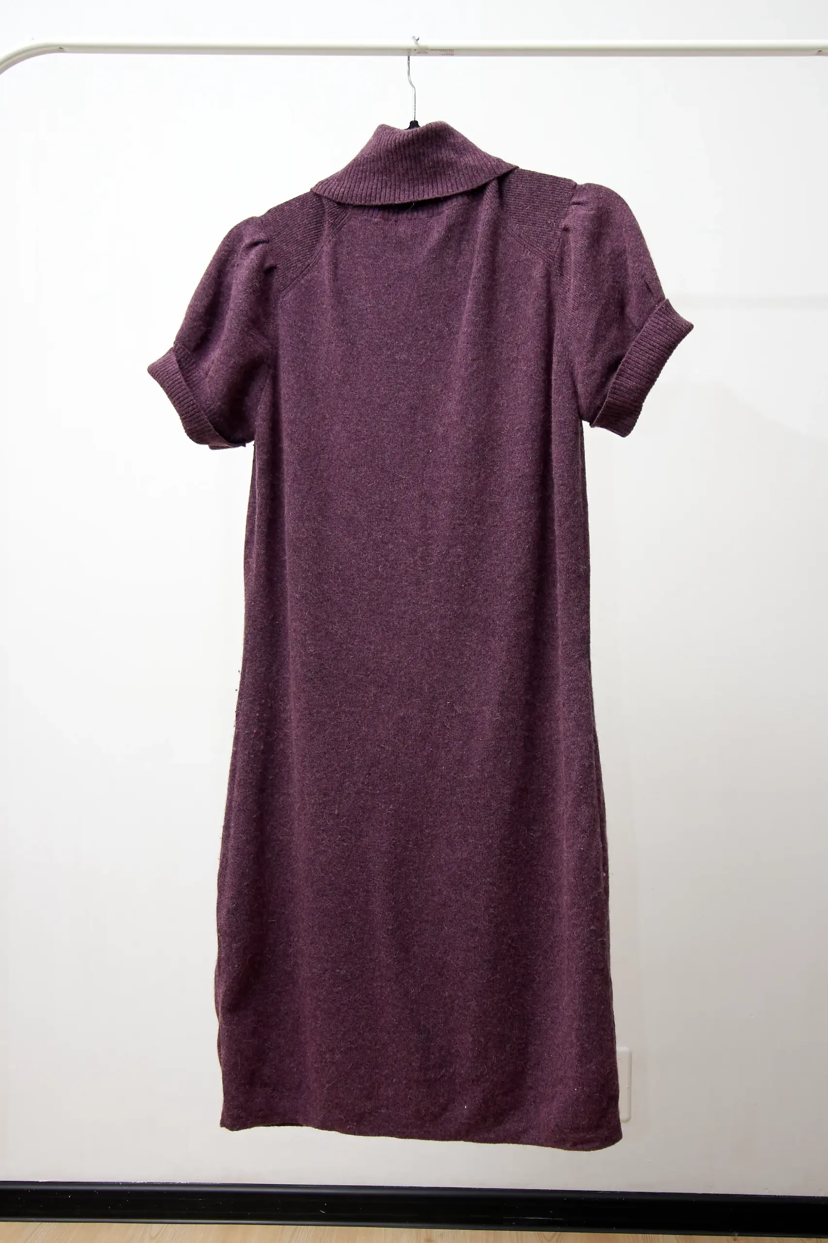 Rochie din tricot cu nasturi, buzunare frontale, mâneci scurte. 35% lână, 37% viscoză, 20% nylon, 5% angora, 3% cașmir. Lungime 97cm, talie până la 100cm.