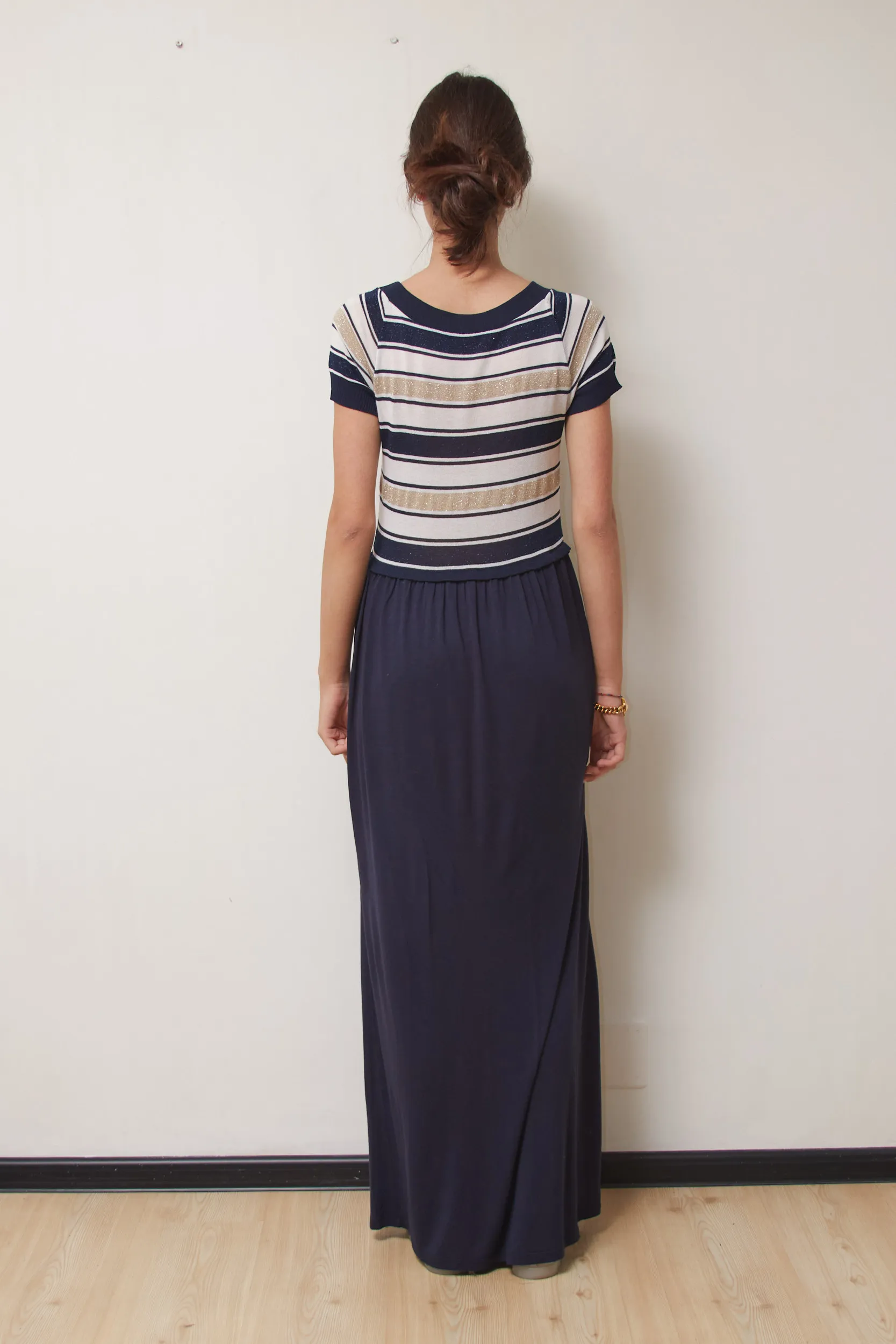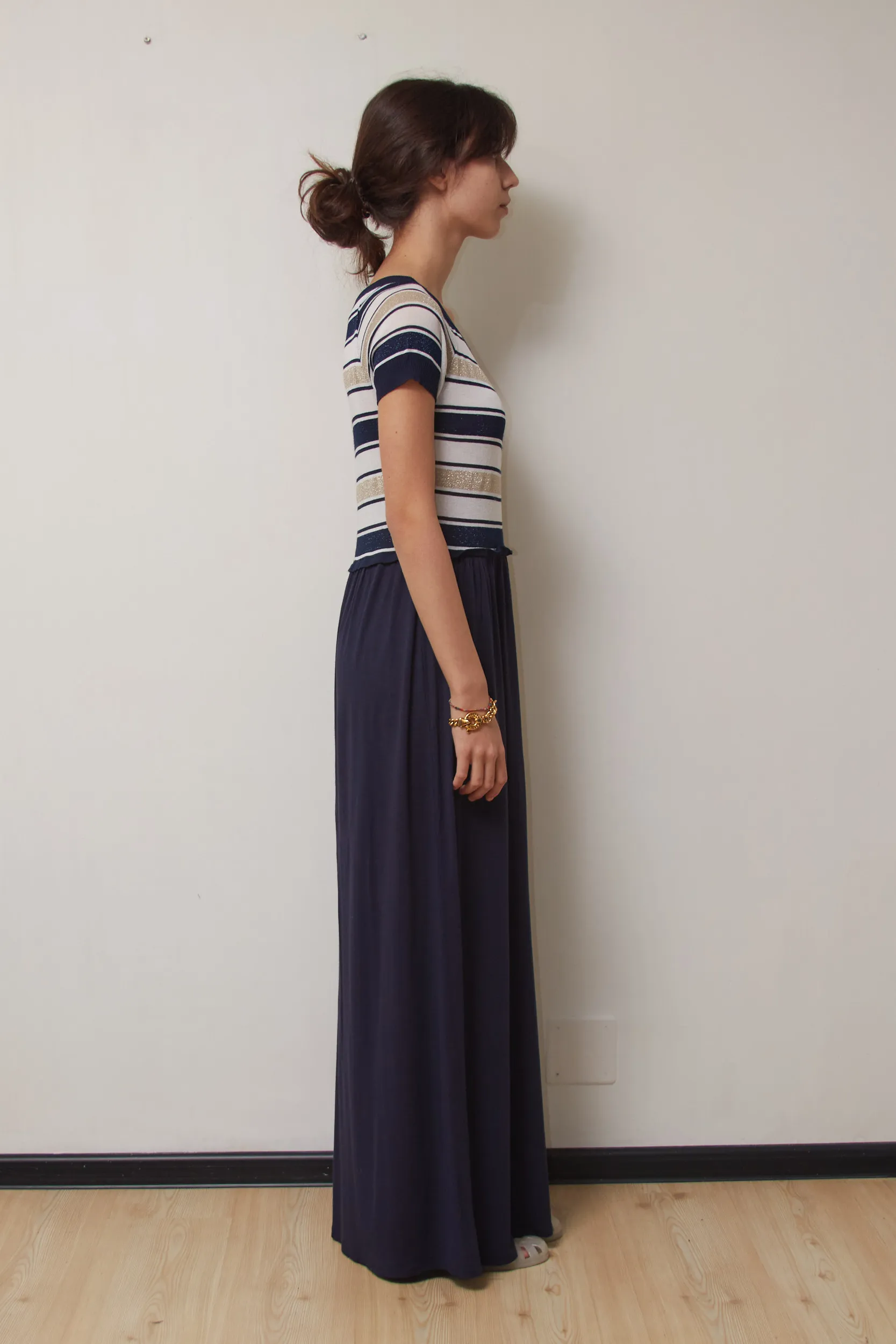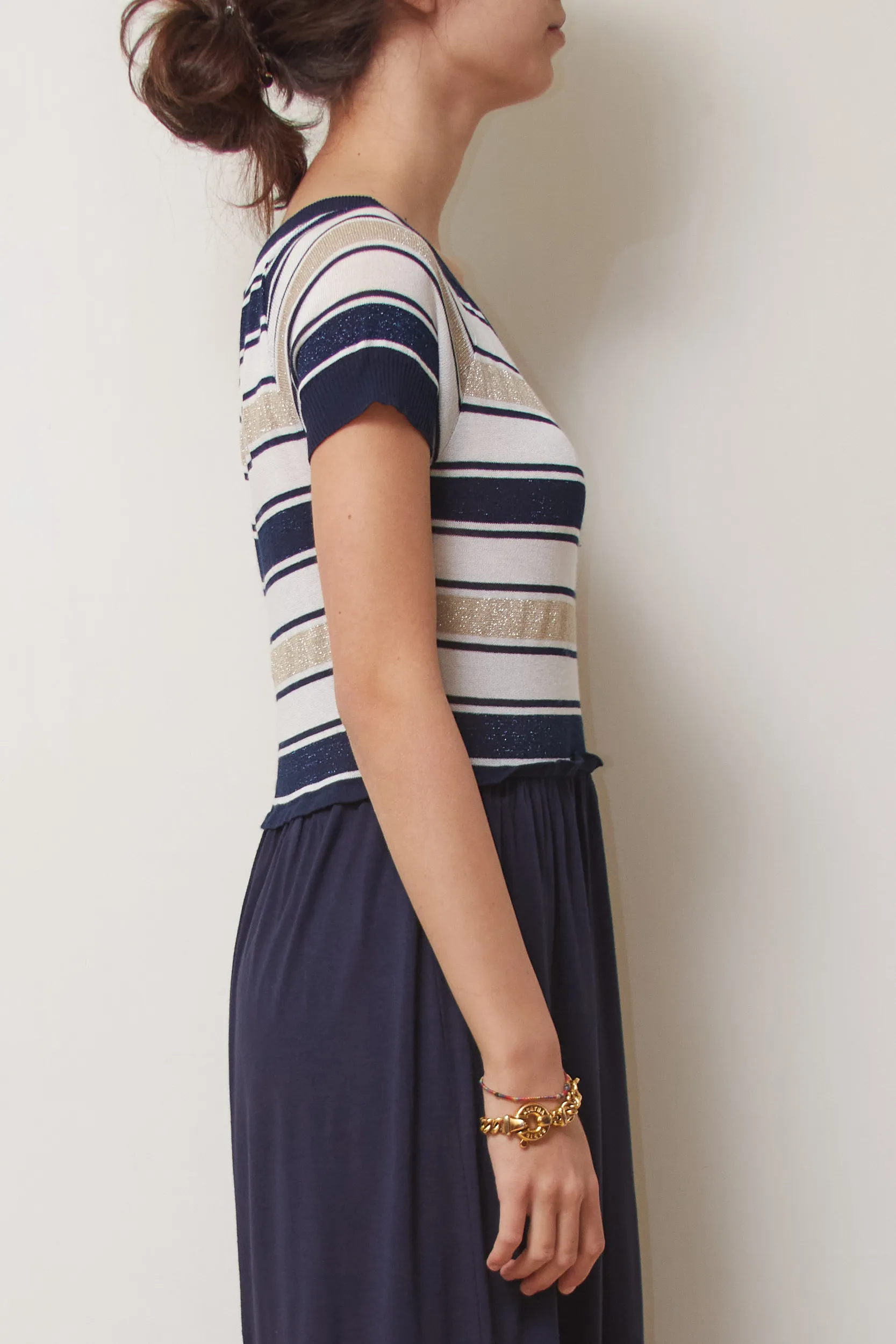 Stil Marinăresc cu fir metalic. Este o rochie ‘combo’ Partea de sus este tricotată, cu dungi în stil navy și inserții de fir auriu/argintiu (lurex) pentru un pic de strălucire, iar partea de jos este fluidă.