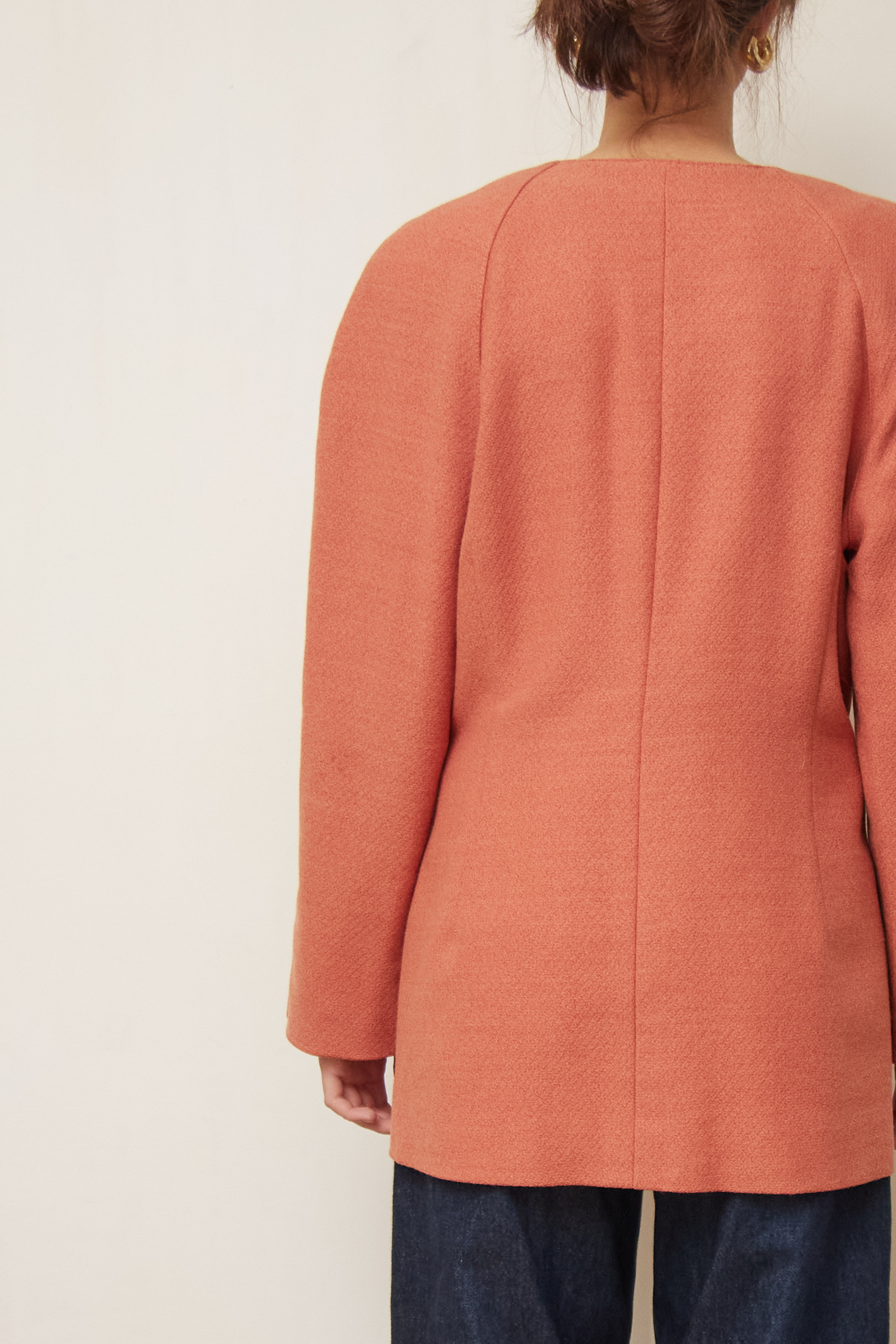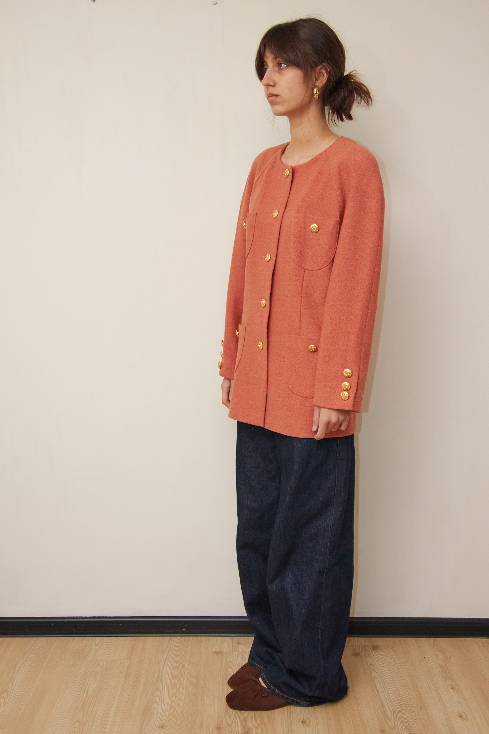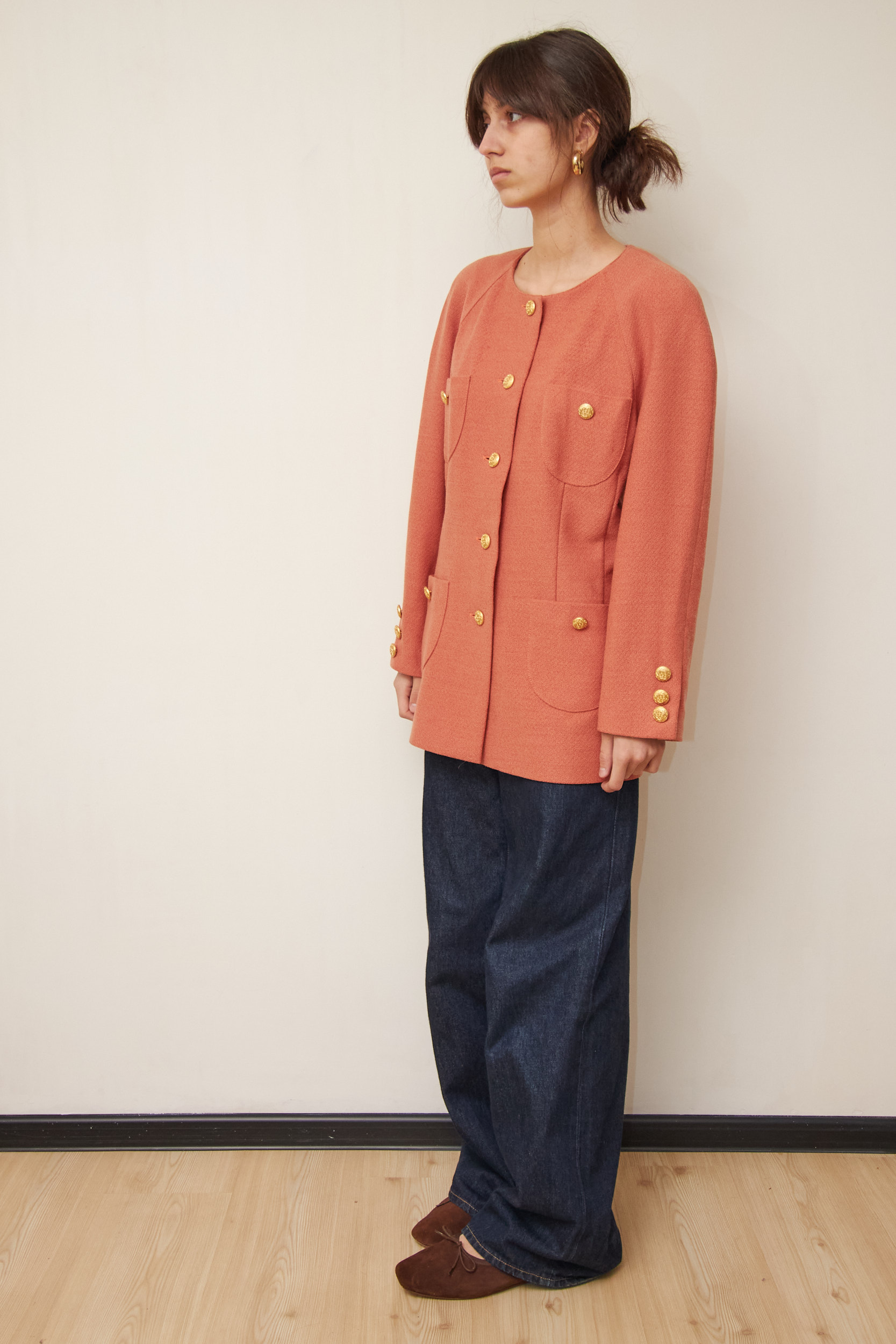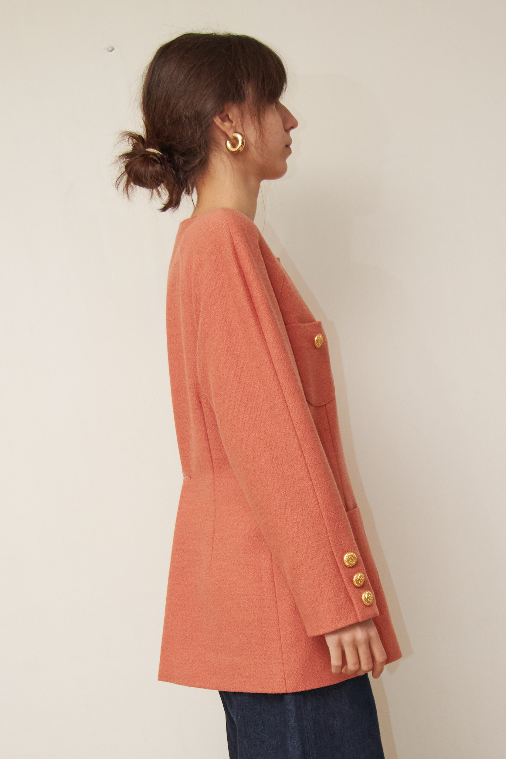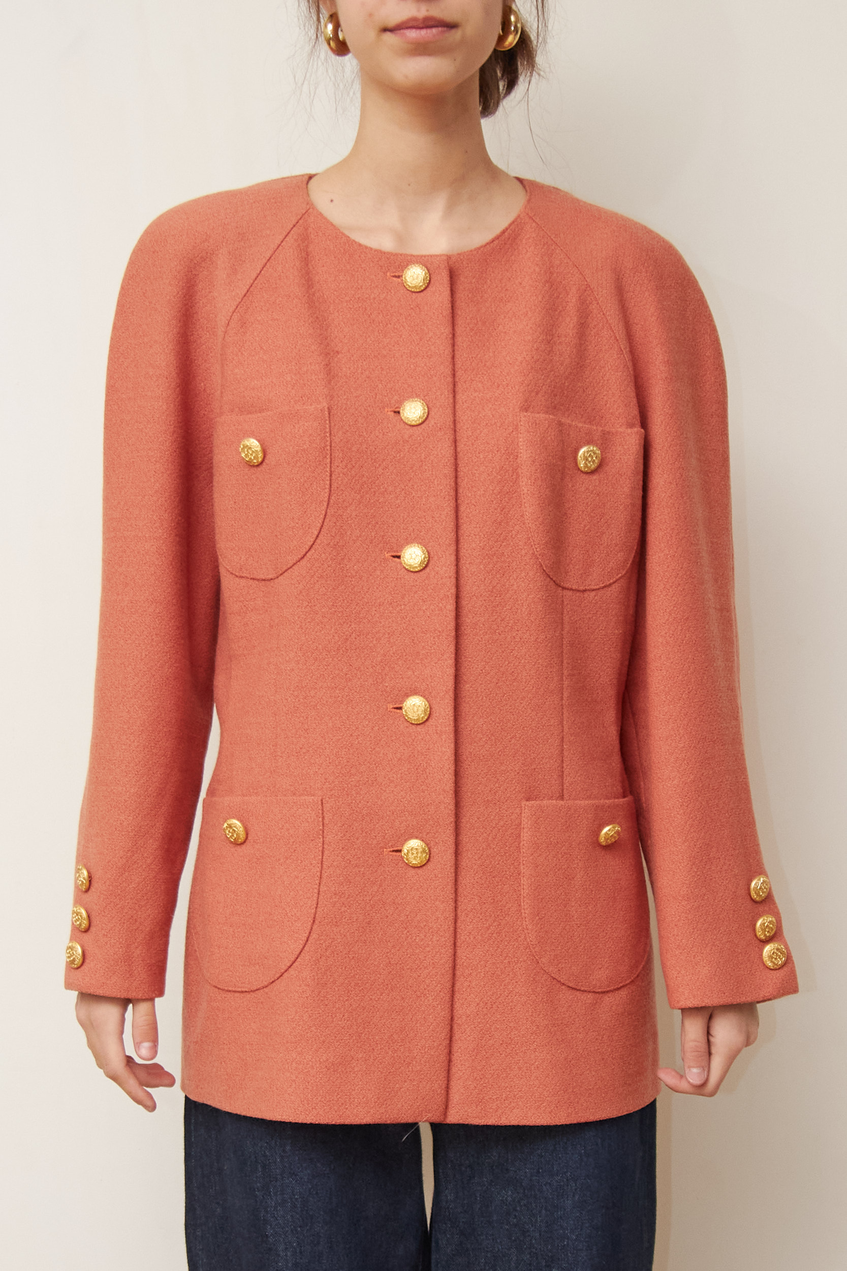 Designul este clasic, fără rever, cu o croială dreaptă și structurată, specifică anilor ’80-’90. Din stofă texturată din Lână Virgină, care își păstrează forma impecabil. Nuanța deosebită – un amestec între roz somon închis și cărămiziu. Nasturii metalici cu model în relief oferă un aer regal. Cele 4 buzunare frontale sunt funcționale.