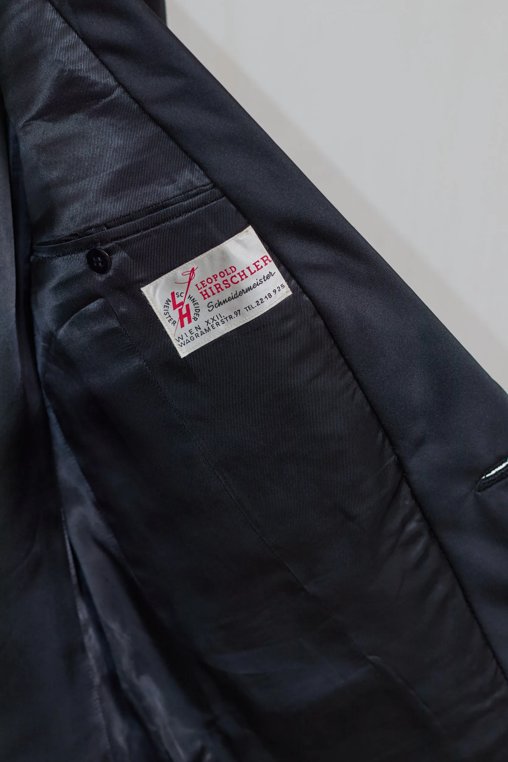 Acest sacou de gală a fost realizat de maestrul croitor Leopold Hirschler în Viena. Este definiția eleganței atemporale: guler rotund din satin („Shawl Collar”), lână neagră profundă și o construcție curată, minimalistă, fără clape la buzunare,pentru a menține silueta impecabilă.