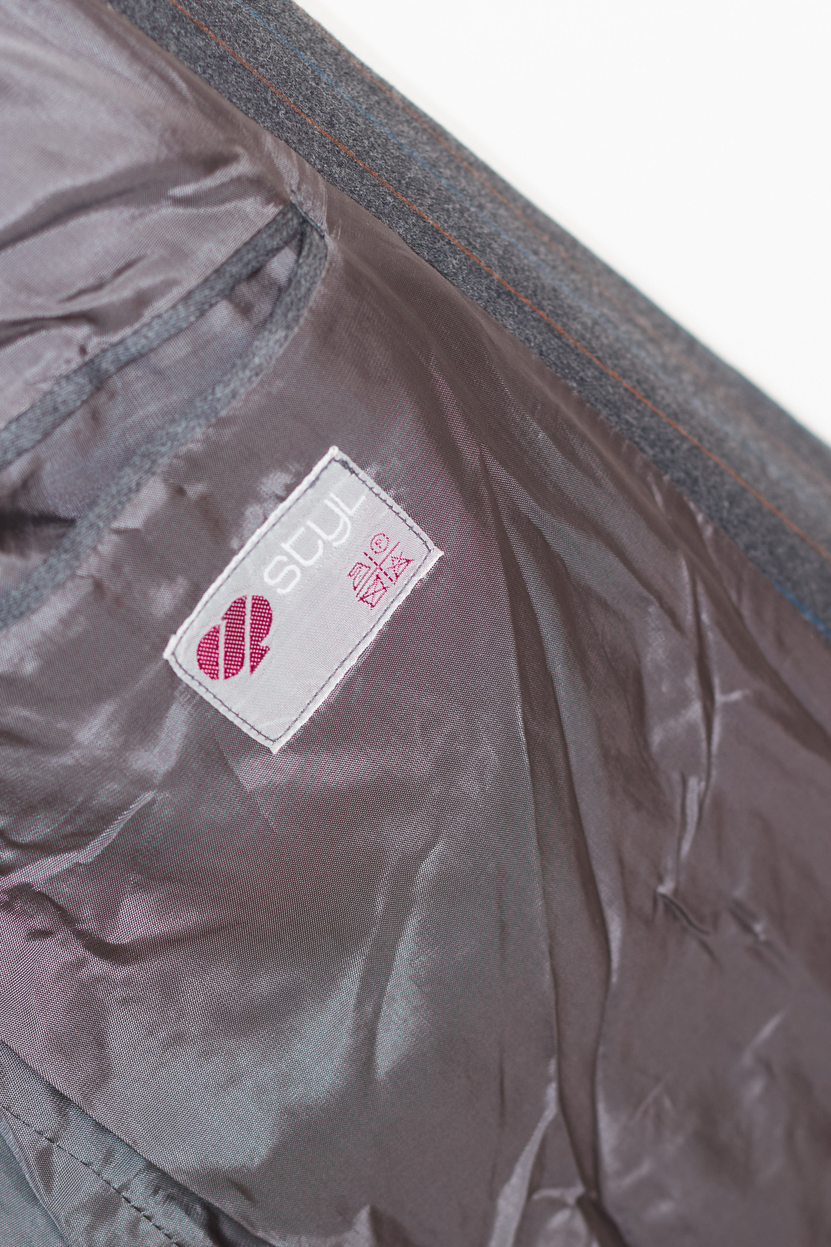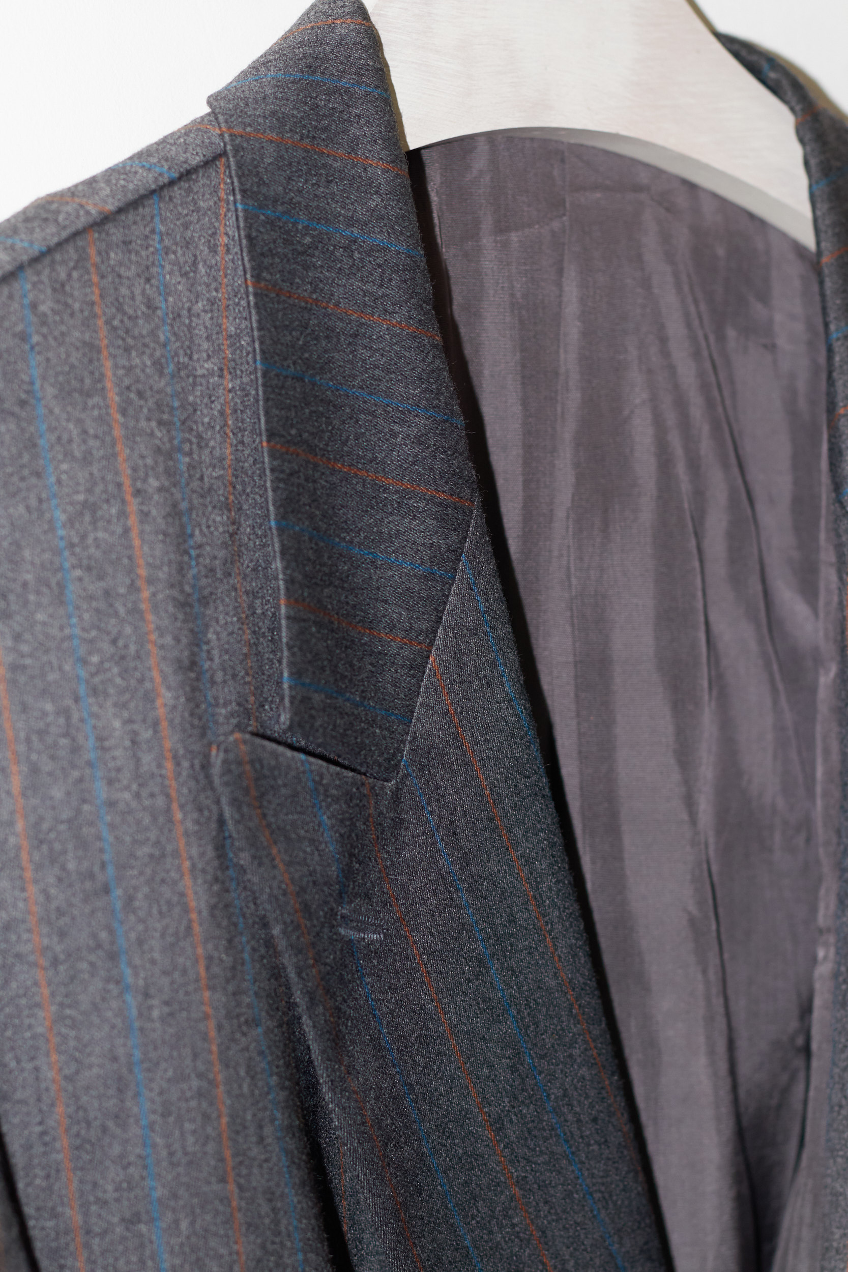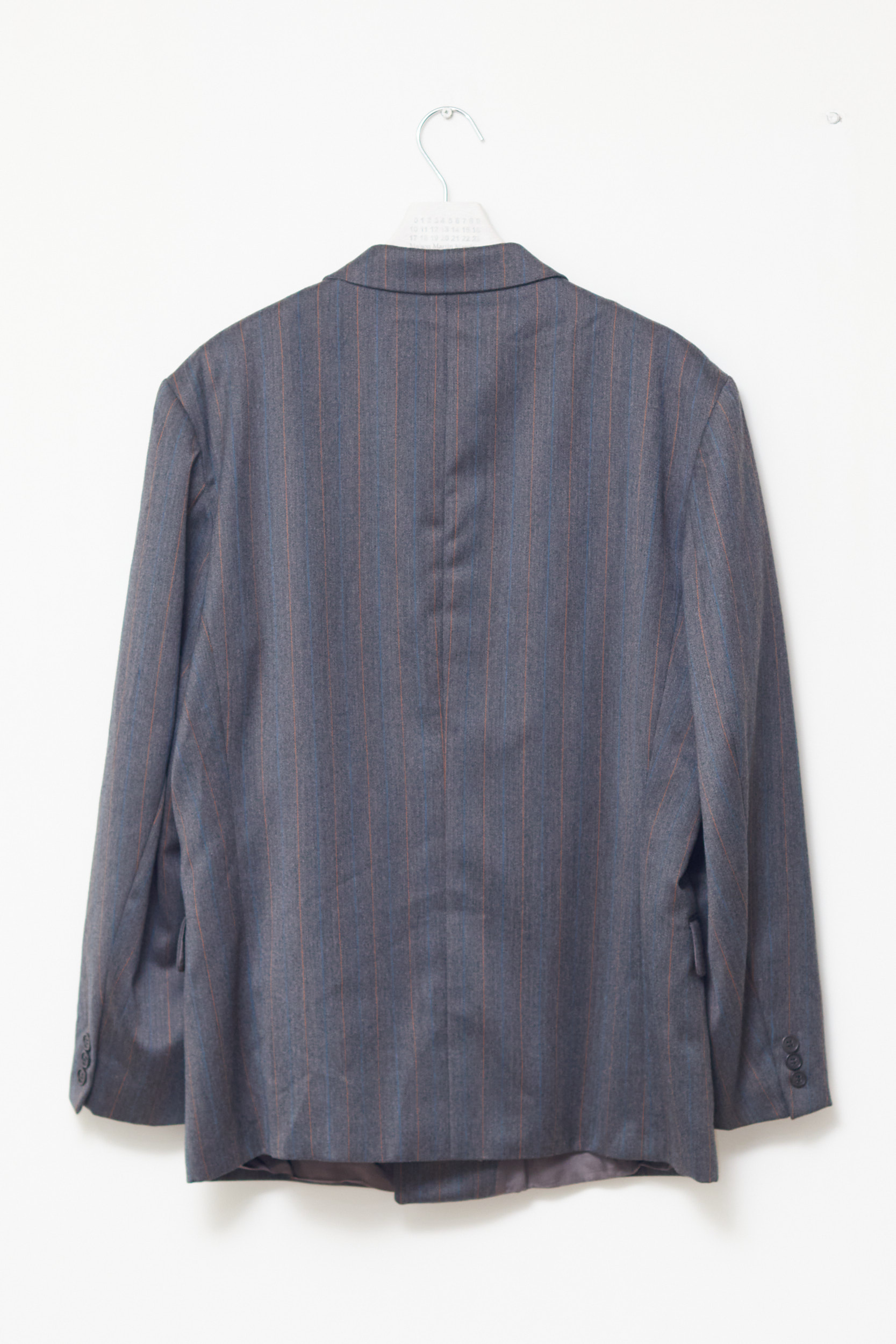 Este un sacou clasic bărbătesc (dar genial pentru fete, purtat oversized), cu închidere la două rânduri de nasturi. Culoarea este un gri închis cu dungi fine (pinstripes) în nuanțe de cărămiziu și albastru.