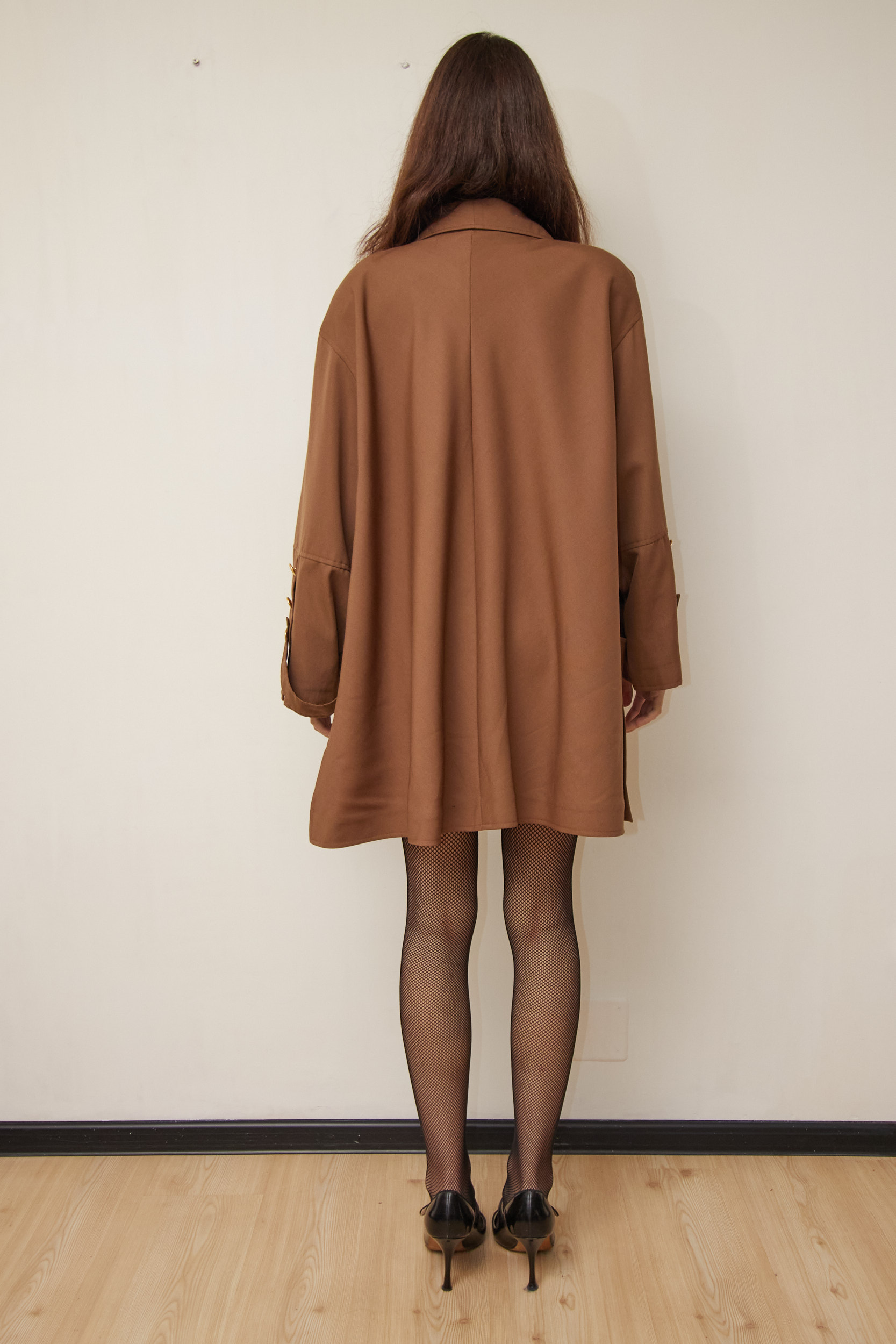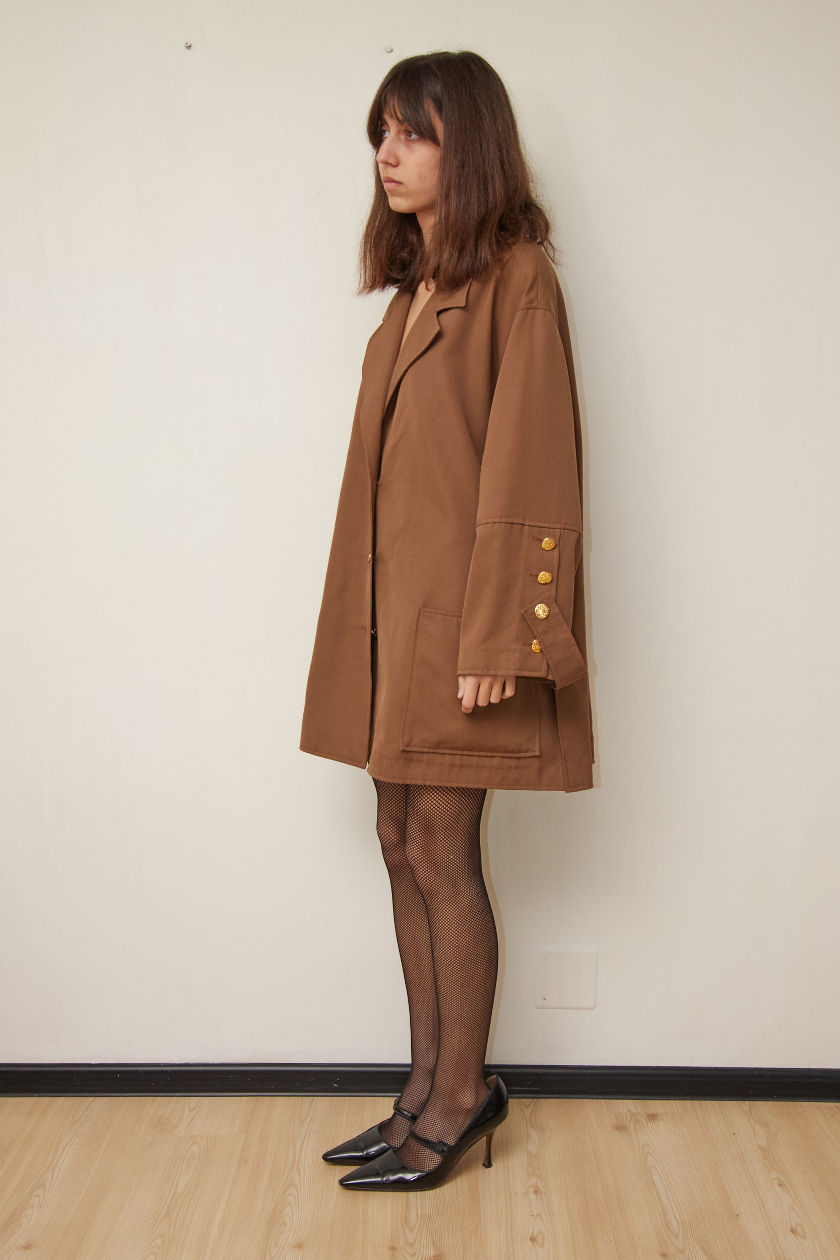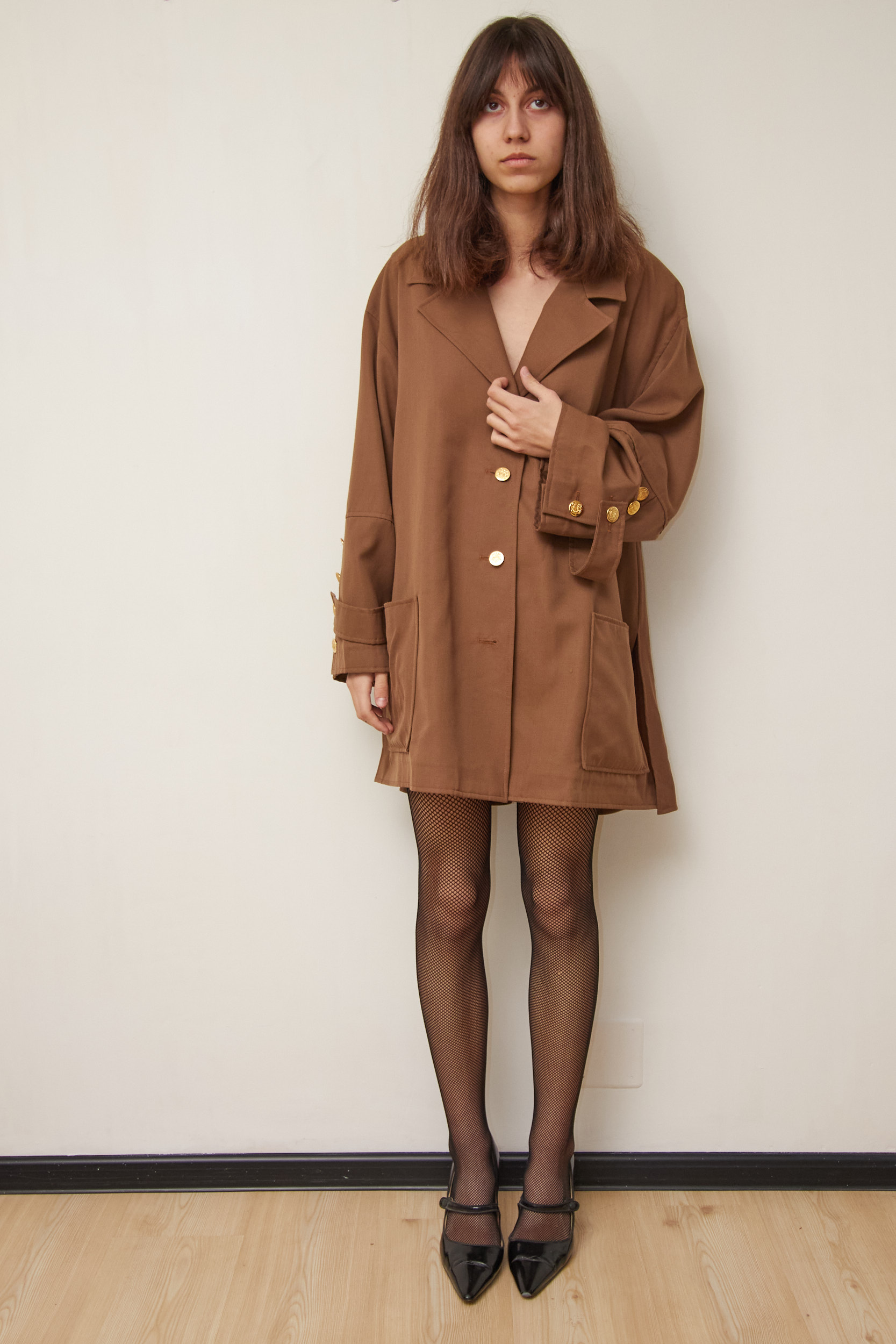Haina este un hibrid între un sacou lung și un trench coat, ideală pentru momentele când un palton de iarnă e prea gros, dar un sacou e prea subțire. Materialul este un amestec inteligent: 45% Lână Virgină pentru aspect natural și căldură, combinată cu 55% Poliester care previne șifonarea excesivă și îi oferă durabilitate. Necăptușită. Nasturi metalici aurii gravați frontal si pe mâneci.